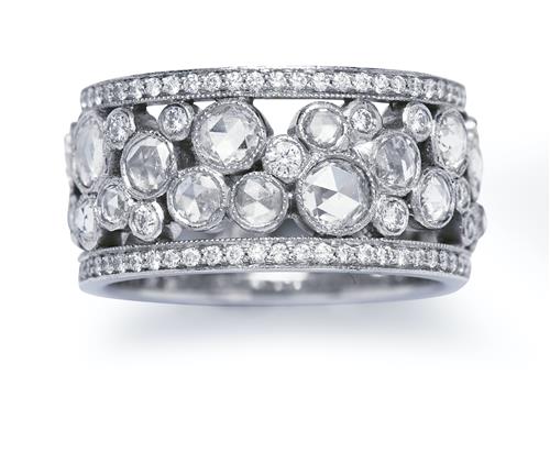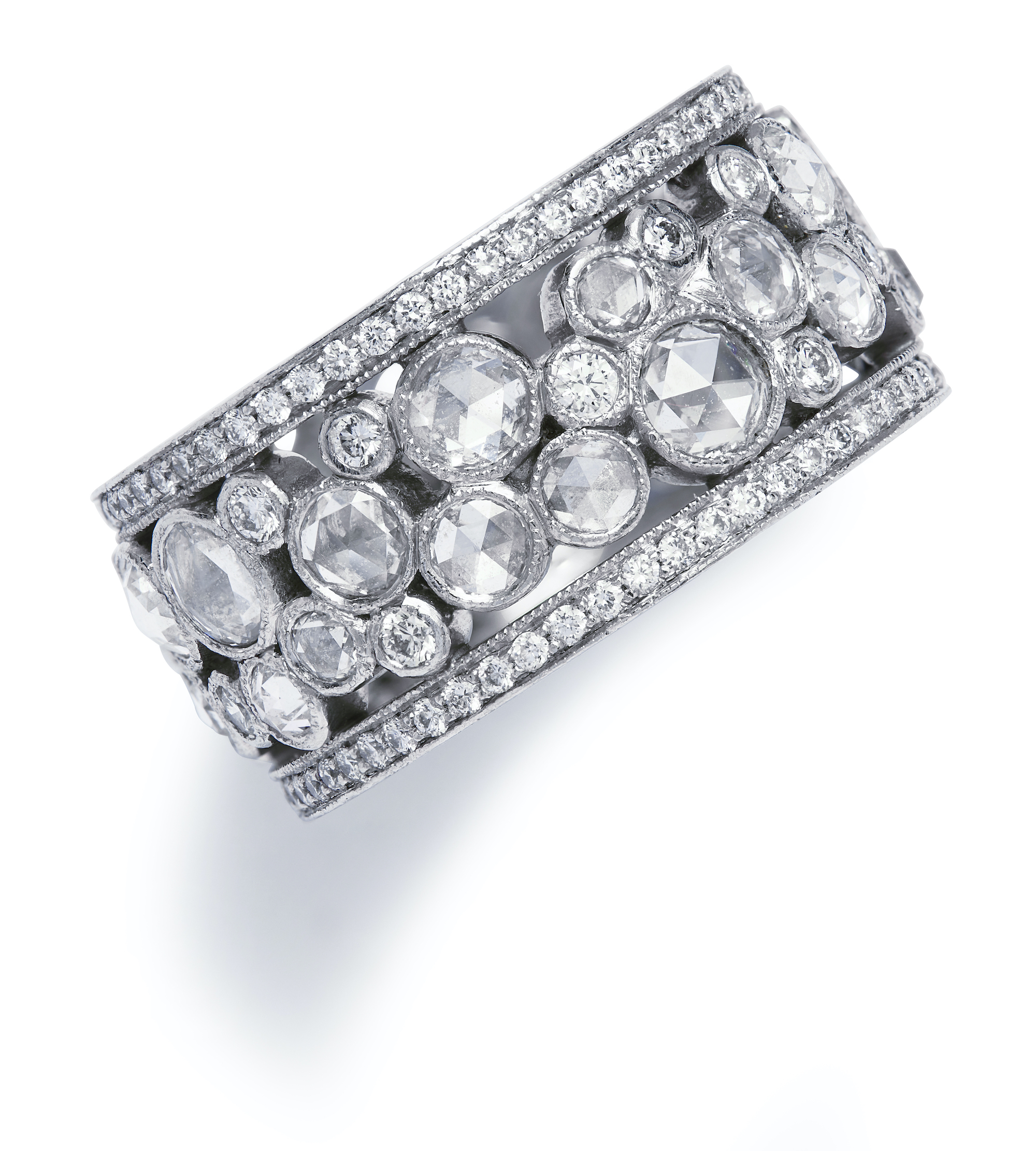 Designed as a 10mm wide openwork band continuously collet-set with variously sized rose and brilliant-cut diamonds, flanked by a line of millegrain-set diamonds, size K1/2, signed Tiffany & Co.