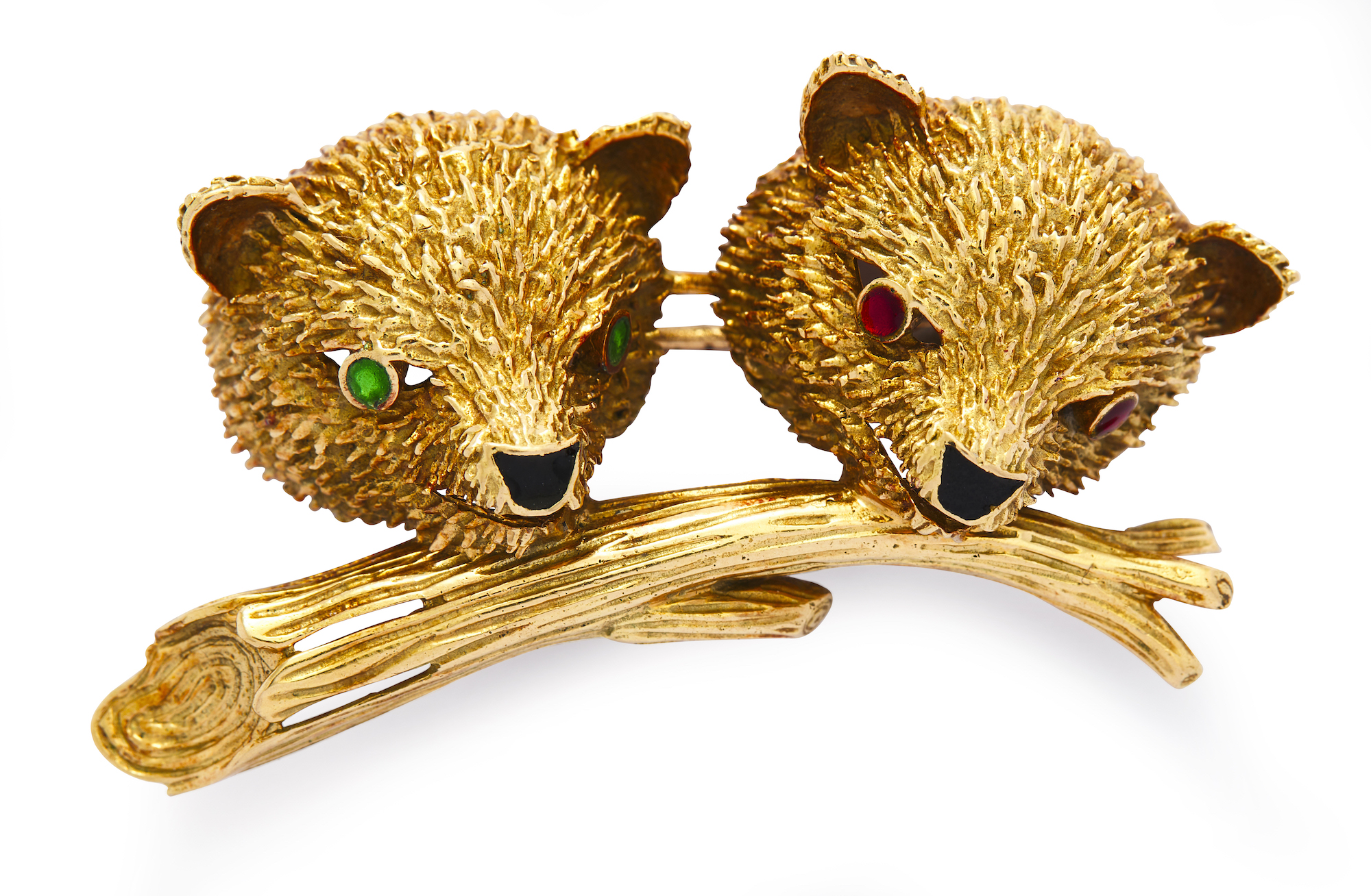 Modelled as a pair of naturalistic bear cubs resting on a branch, the eyes collet-set with a cabochon emerald and ruby respectively, the nose accented with black enamel, measuring approximately 24mm x 44mm, signed Fred, Paris.