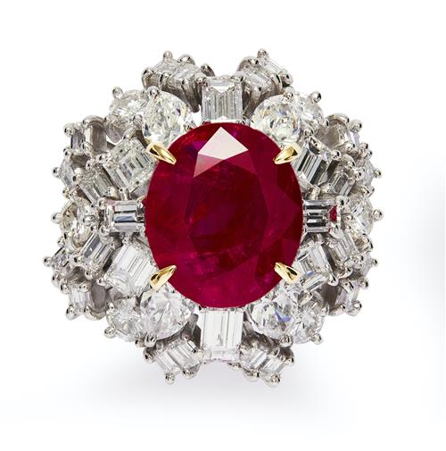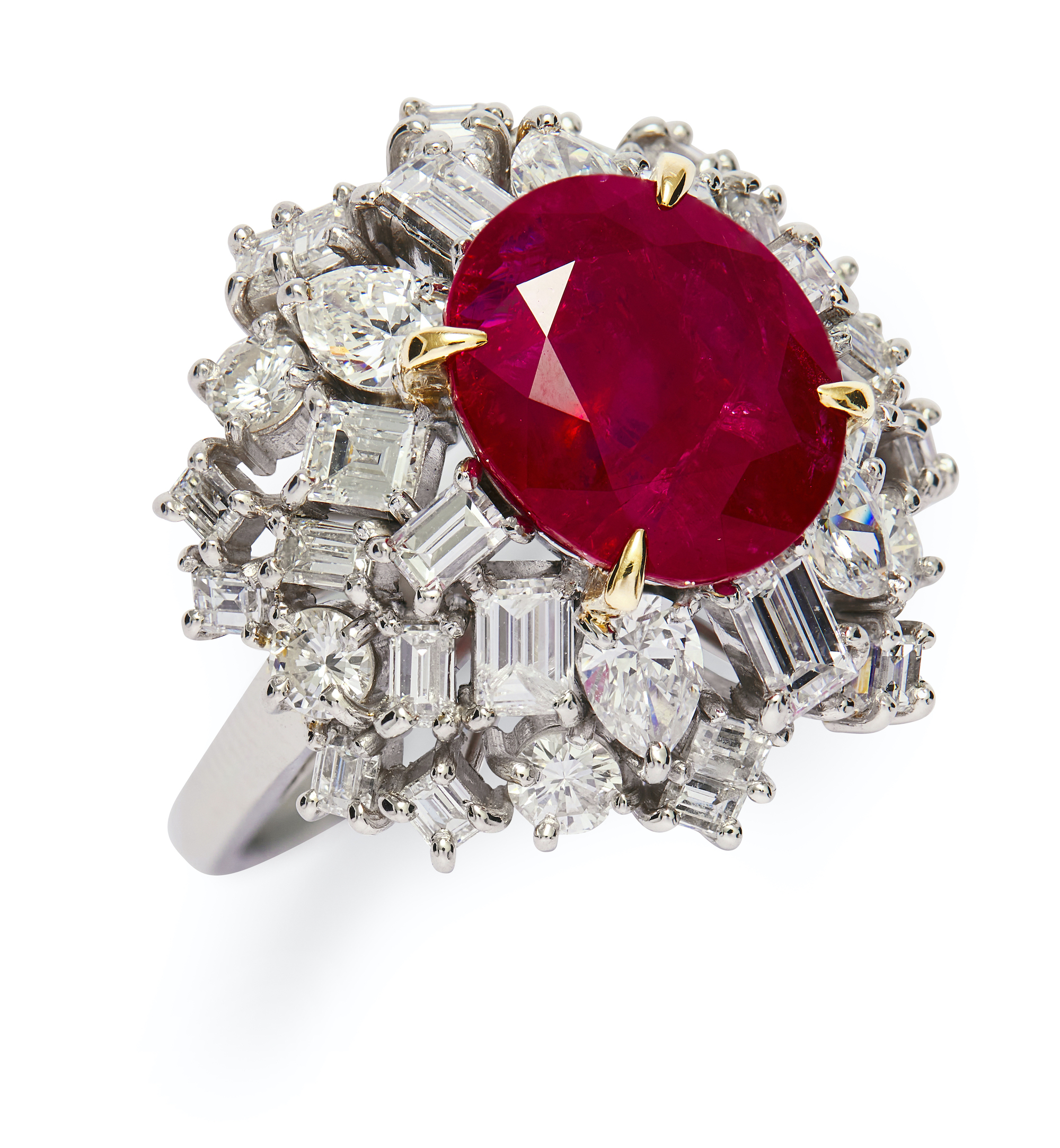 Of bombe form, modelled as a cluster, centring an oval red ruby weighing 5.18 carats, claw-set within an openwork asymmeterical surround of baguette, pear-shaped and brilliant-cut diamonds, the diamonds together weighing approximately 3.08 carat, size L1/2.