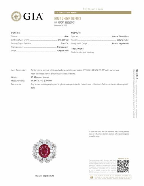 Accompanied by a GIA report numbered 3365651431, dated 24 November 2020, stating that the ruby is natural, with no indications of heating, Burma (Myanmar) origin.