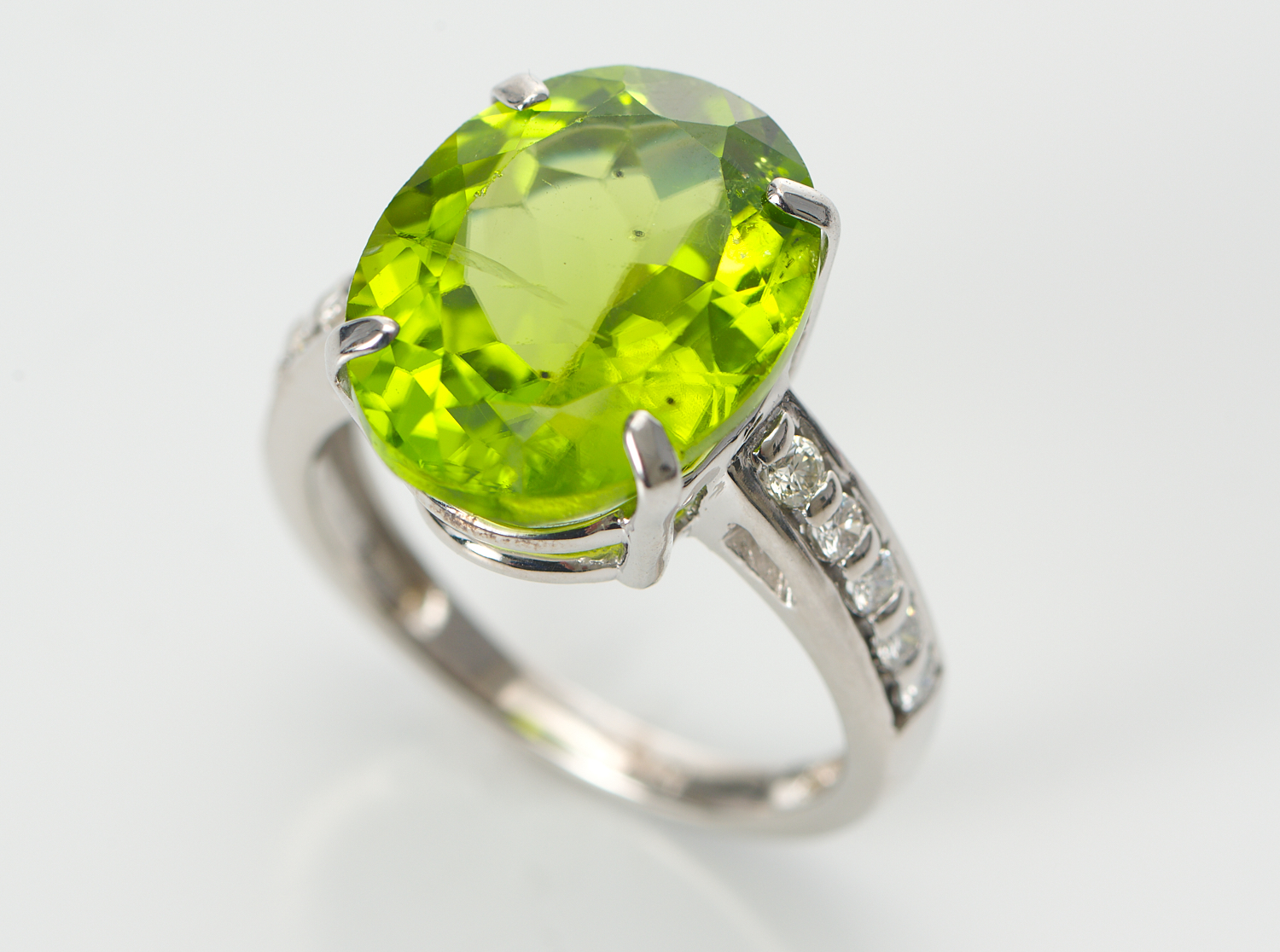 A LARGE PERIDOT AND DIAMOND RING IN 18CT WHITE GOLD, COMPRISING AN OVAL CUT PERIDOT WEIGHING 10.10CTS, SHOULDERED BY ROUND BRILLIANT CUT DIAMONDS TOTALLING 0.15CT, SIZE M, 6GMS