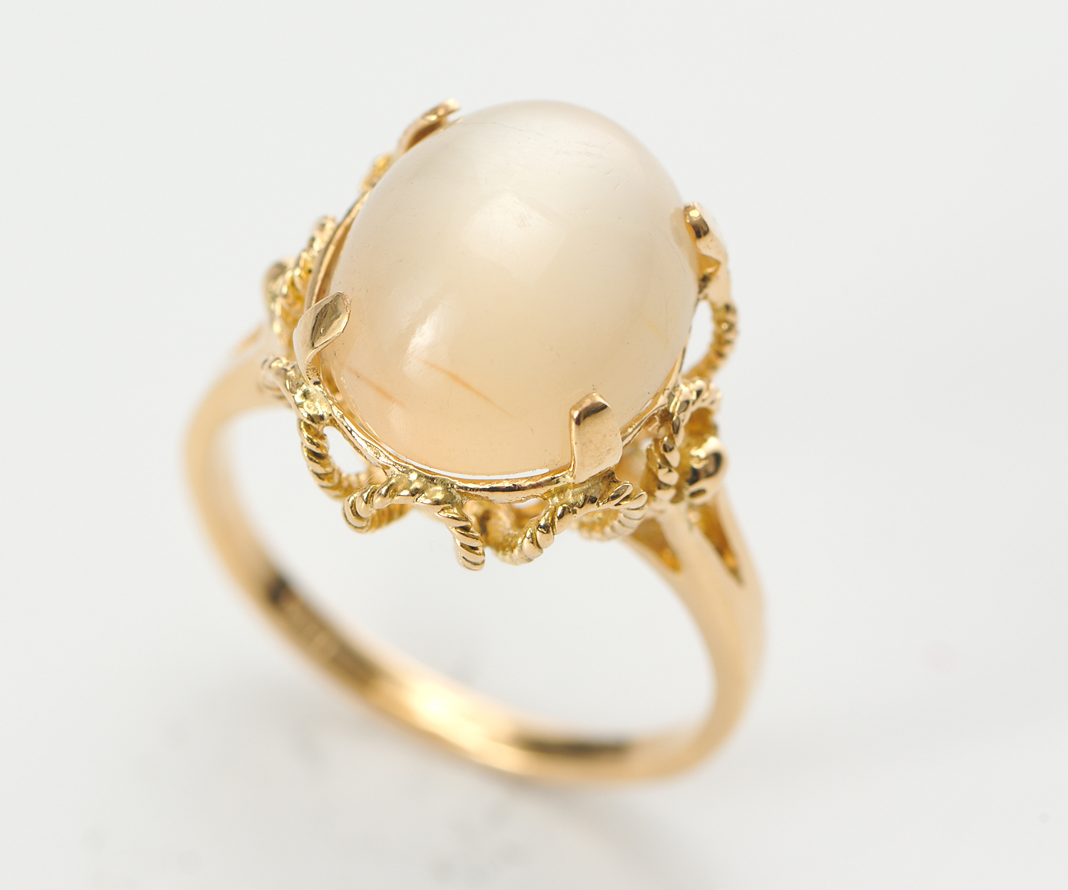 A MOONSTONE CABOCHON RING IN 18CT GOLD, SIZE L-M, 4.7GMS