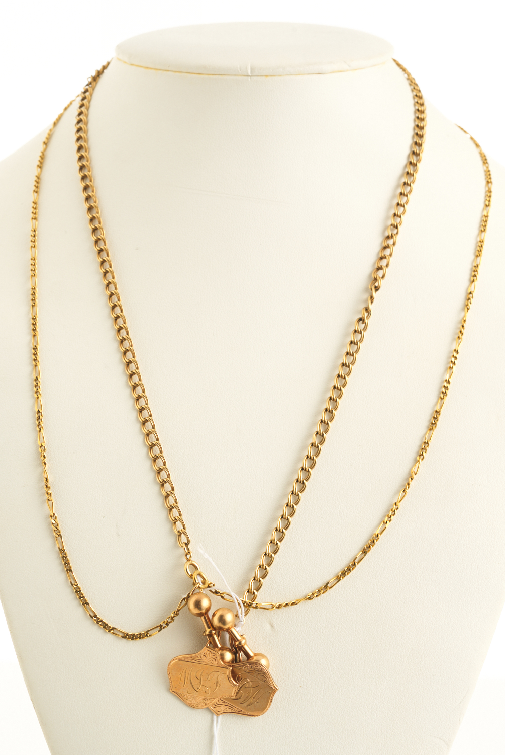 A PAIR OF ANTIQUE CUFFLINKS, TOGETHER WITH TWO CHAINS, ALL IN 9CT GOLD, 24.1GMS