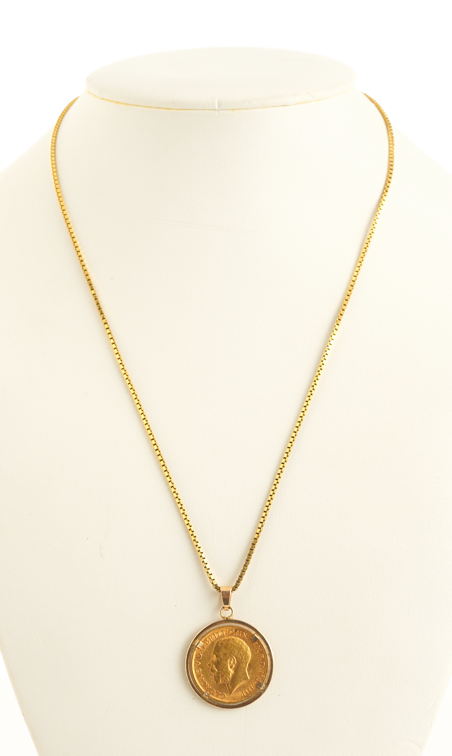 A 1911 SOVEREIGN PENDANT IN 9CT, TO A GOLD PLATED CHAIN