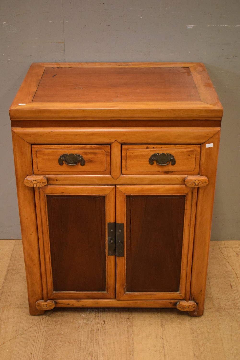 A CHINESE TIMBER TWO DOOR CABINET (A/F) (REPAIRS TO DOORS) (84H x 67W x 50D CM) (LEONARD JOEL DELIVERY SIZE: LARGE)