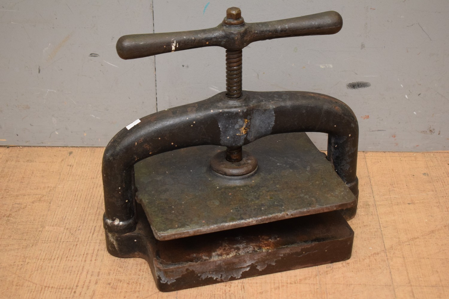 A CAST IRON BOOK PRESS (40H X 40W X 25D CM) (PLEASE NOTE THIS HEAVY ITEM MUST BE REMOVED BY CARRIERS AT THE CUSTOMER'S EXPENSE. LEONARD JOEL STAFF CANNOT ASSIST CARRYING THIS ITEM) (X-LARGE ITEM)