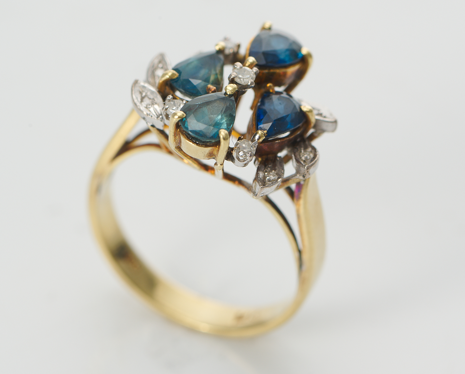A VINTAGE SAPPHIRE AND DIAMOND DRESS RING IN 14CT GOLD, SIZE O/P, 5.7GMS, A/F.