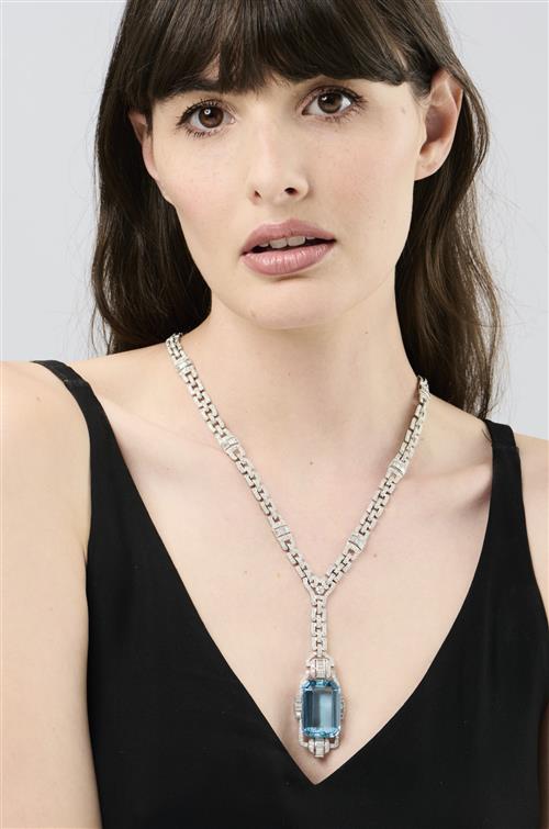 Comprising of a necklace modelled as a line of openwork geometric links pavé-set with brilliant-cut diamonds between rectangular spacers channel-set with baguette diamonds, supporting an emerald-cut aquamarine measuring approximately 28mm x 19.62mm x 11.72mm, framed by an openwork surround decorated with diamonds, the diamonds together weighing approximately 14.00 carats, circumference approximately 500mm, pendant length approximately 55mm.