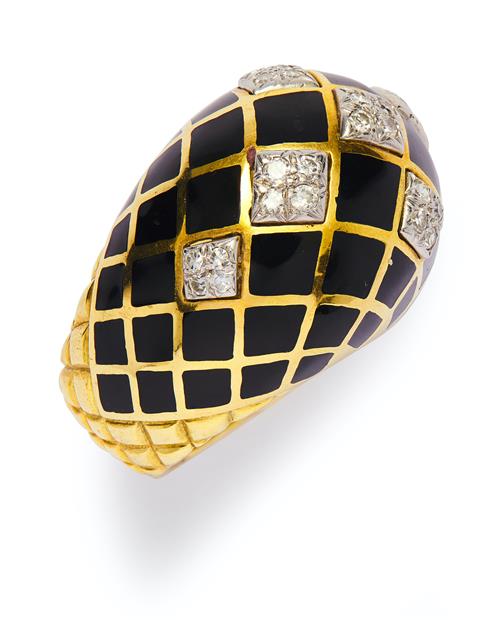 Of bombe form decorated in a honeycomb pattern, the top pavé-set at intervals with circular-cut diamonds between applied black enamel plaques to a textured half hoop, size L, signed Webb for David Webb.