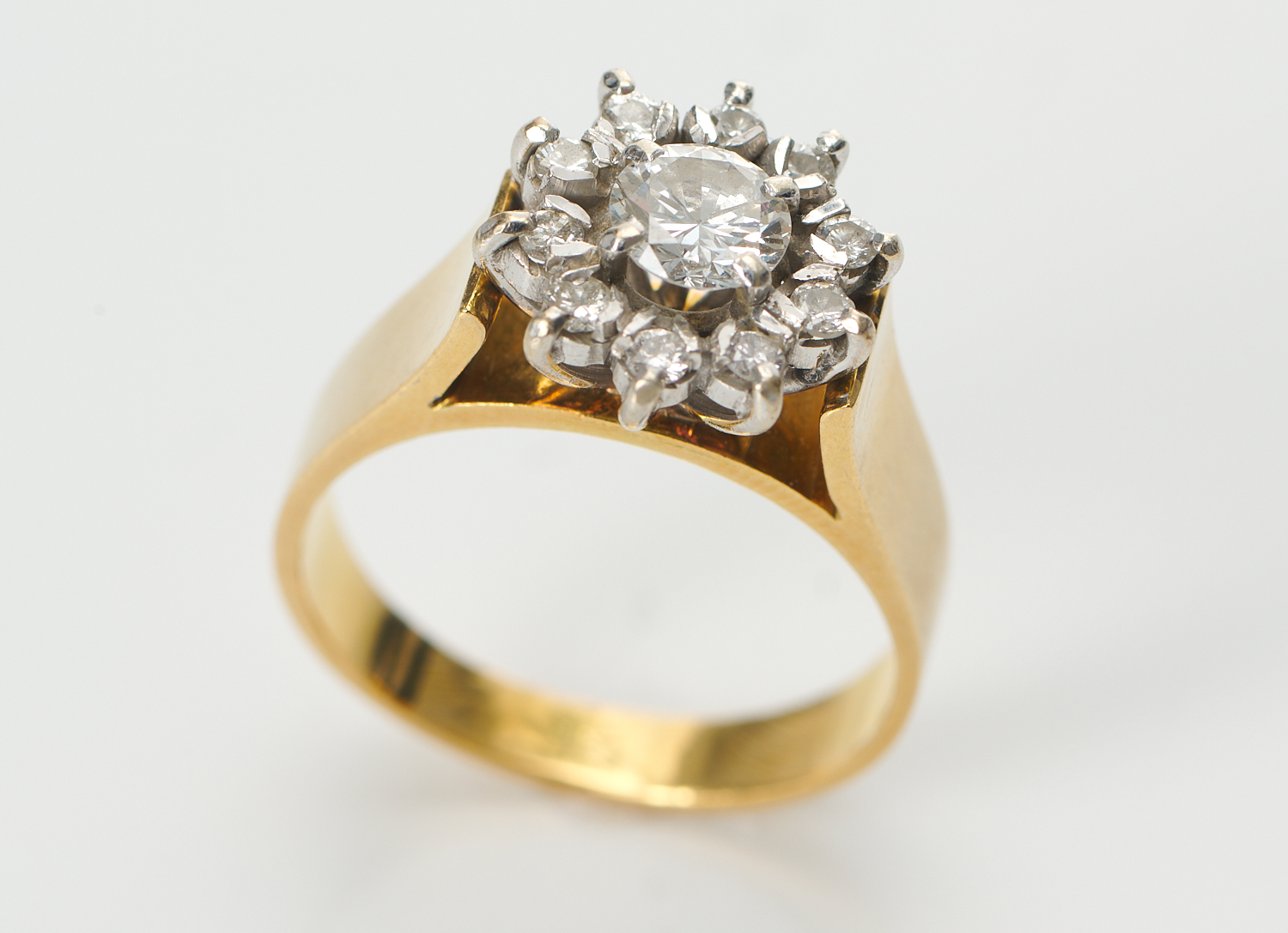 A DIAMOND CLUSTER RING IN 18CT GOLD, CENTRALLY SET WITH A ROUND BRILLIANT CUT DIAMOND, ESTIMATED 0.50CT, WITHIN A SURROUND OF 10 SMALLER DIAMONDS, SIZE O, 6.6GMS