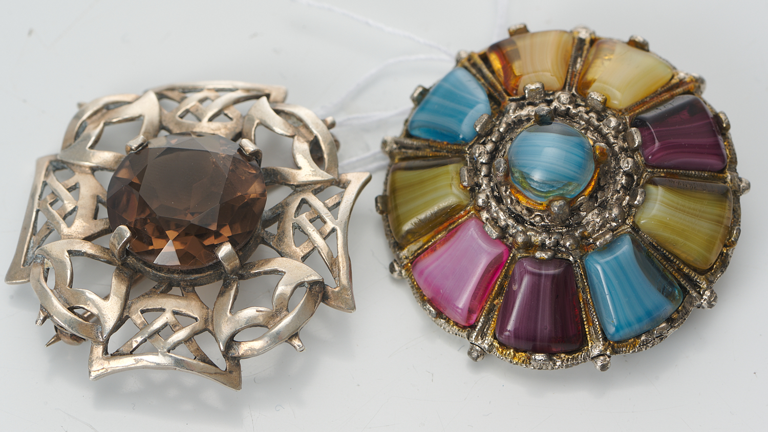 A SMOKEY QUARTZ BROOCH IN SILVER, SCOTTISH HALLMARKS, LENGTH 40MM TOGETHER WITH ANOTHER BROOCH, DIAMETER 50MM