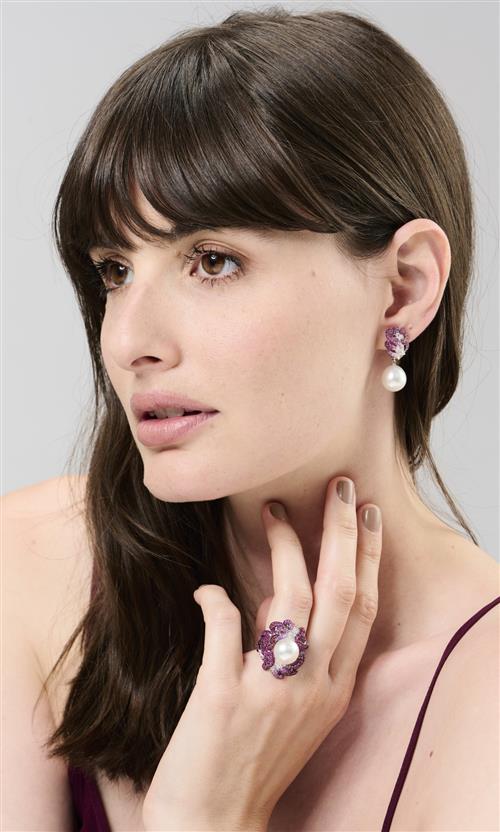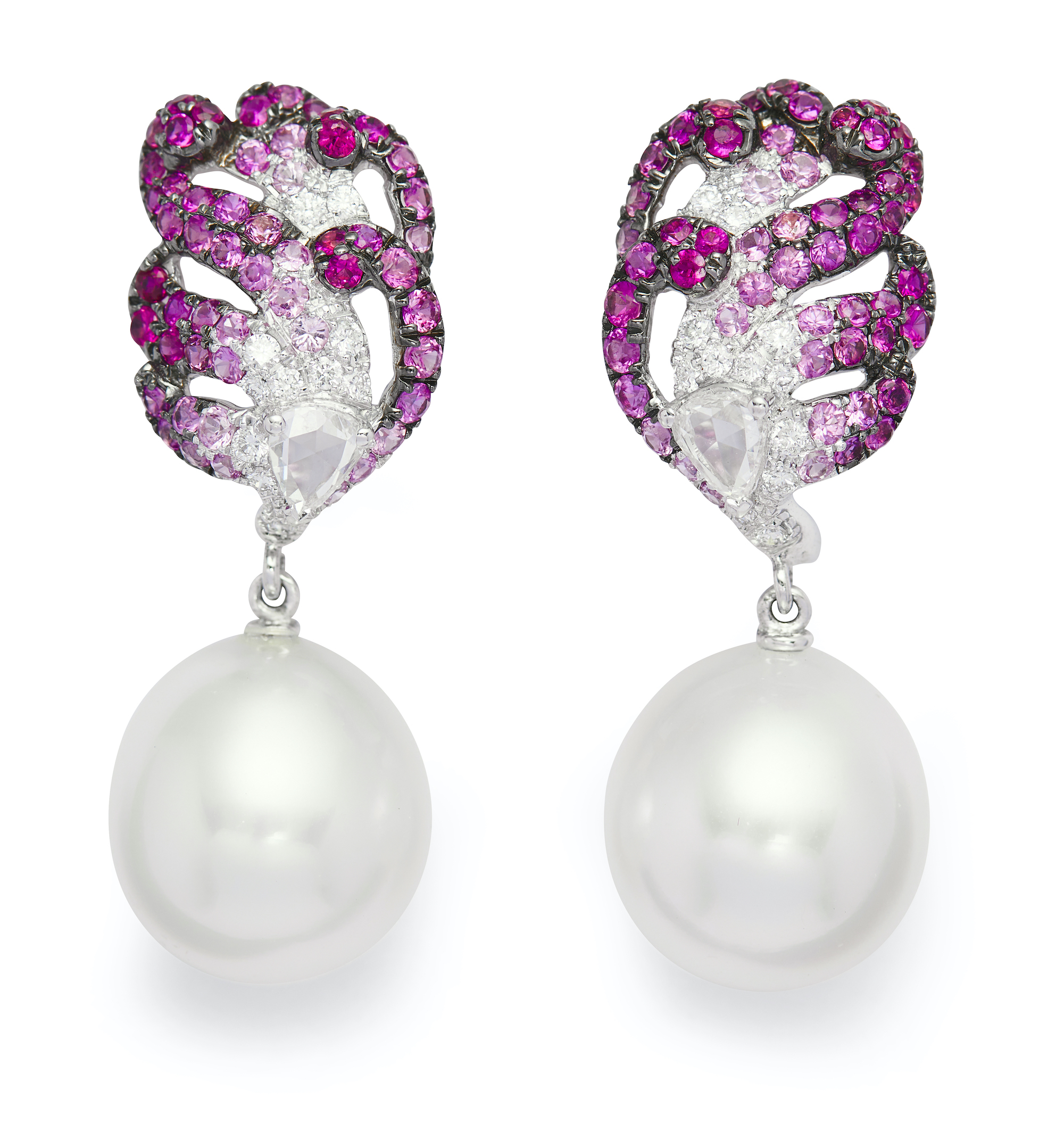 PAIR OF 18CT WHITE GOLD, RUBY, PINK SAPPHIRE, DIAMOND AND AUSTRALIAN SOUTH SEA PEARL EARRINGS, AUTORE