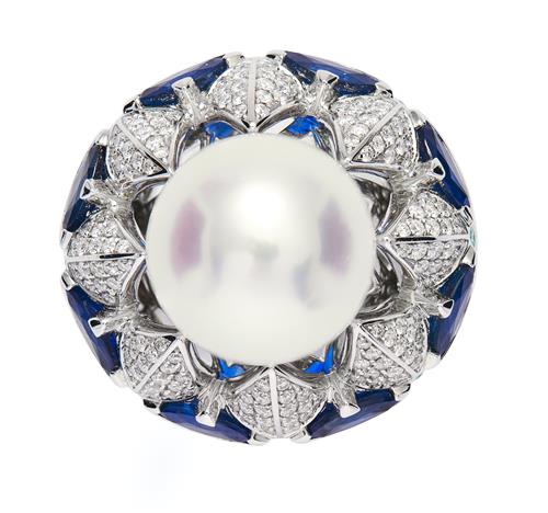 18CT WHITE GOLD, SAPPHIRE, TOURMALINE, DIAMOND AND AUSTRALIAN SOUTH SEA PEARL RING, AUTORE