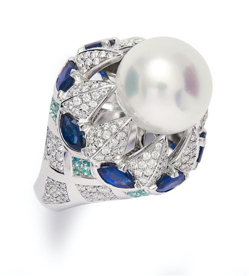 Of bombe design centring a 13.00mm cultured pearl surmounted above an openwork surround decorated with marquise-shaped sapphires, circular-cut Paraiba tourmaline and diamonds, the diamonds together stated to weigh 1.58 carats, size O1/2, signed Autore.