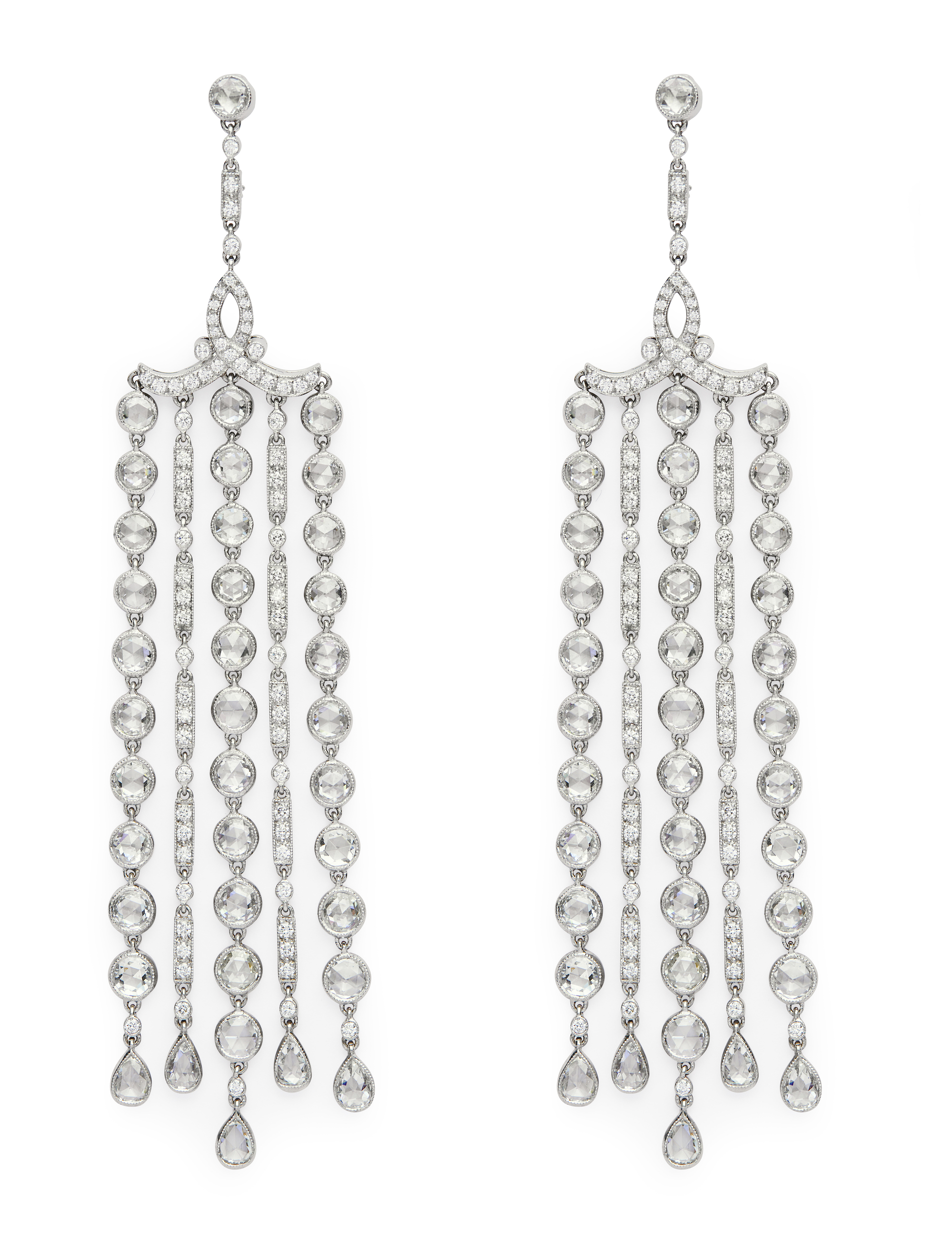 Of chandelier design, each surmount millegrain-set with a rose-cut diamond supporting a stylised ribbon motif pavé-set with brilliant-cut diamonds between a line of diamond connectors, terminating in a five row tassel decorated with rose and brilliant-cut diamonds, the diamonds together weighing approximately 6.85 carats, length approximately 90mm, signed T & Co. for Tiffany & Co., post fittings, one hinged.