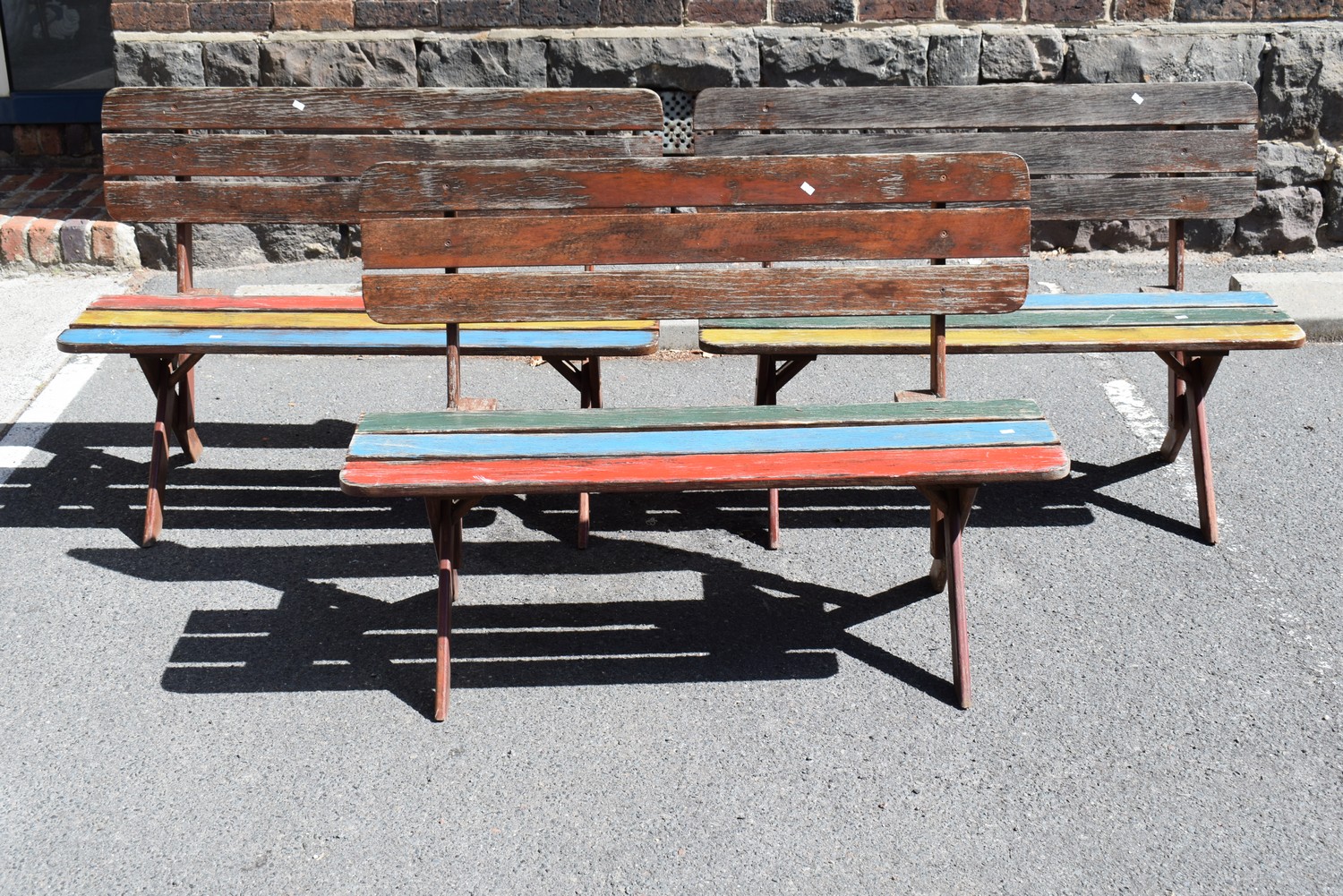 THREE VINTAGE MULTICOLOURED OUTDOOR BENCHES (A/F) (82H X 115W X 55D CM) (LEONARD JOEL DELIVERY SIZE: LARGE)