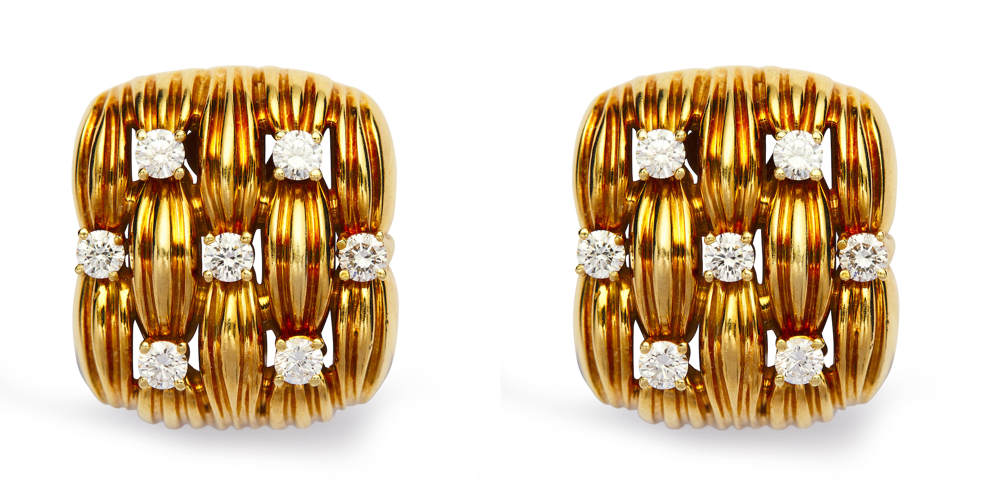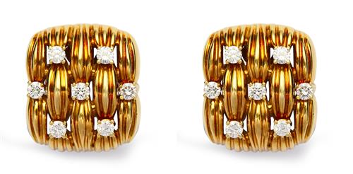 Each of basket-weave design, decorated at intervals with seven claw-set brilliant-cut diamonds, the diamonds together weighing approximately 0.42 carat, approximately 22.5mm x 19.5mm, signed Tiffany & Co. 1992, clip fittings.