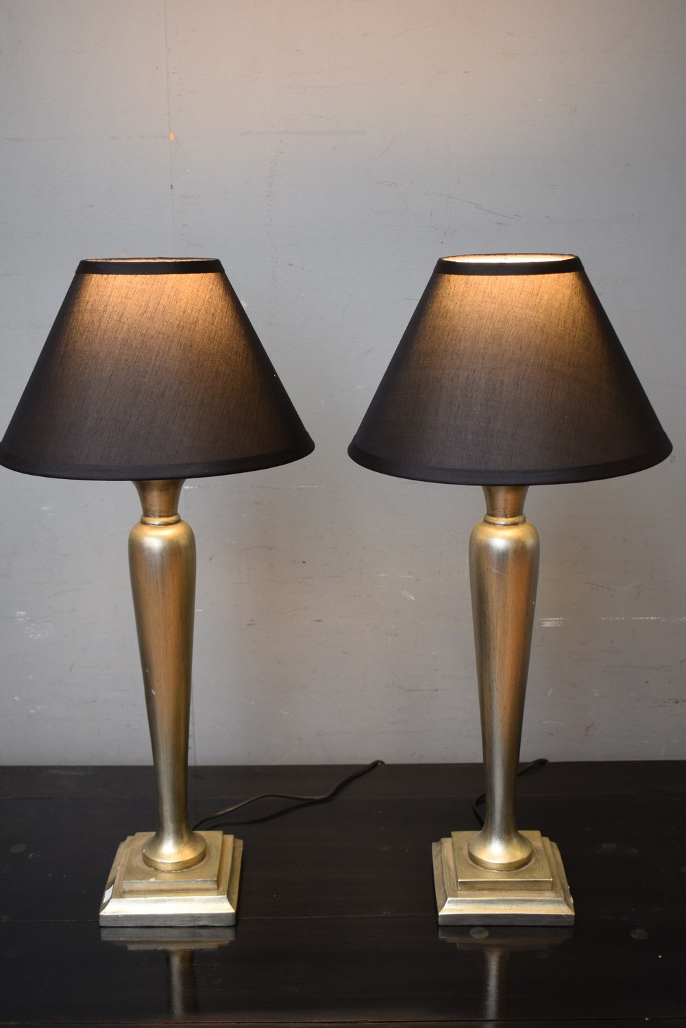 A PAIR OF SILVERED LAMPS WITH BLACK SHADES (66H X 31D CM) (LEONARD JOEL DELIVERY SIZE: MEDIUM)