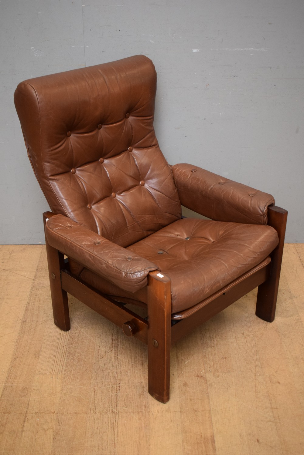 A DANISH DELUXE MID-CENTURY LEATHER RECLINING ARMCHAIR (A/F) (101H X 80W X 80D CM) (LEONARD JOEL DELIVERY SIZE: LARGE)