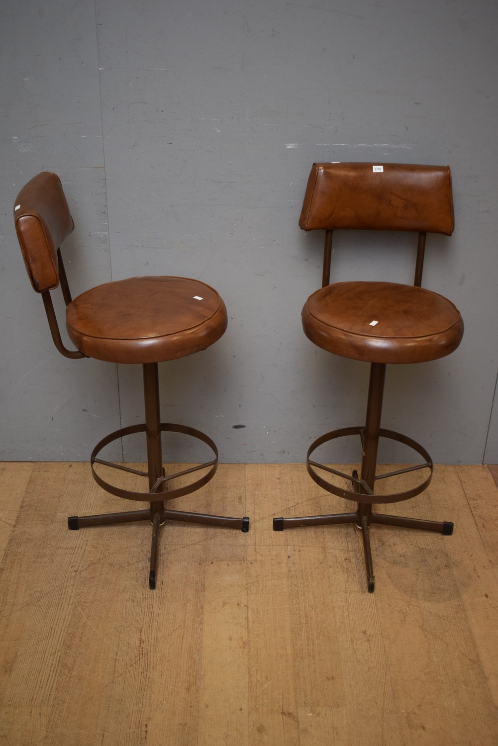 A PAIR OF MID-CENTURY SWIVEL VINYL BAR STOOLS (A/F) (95H X 40W X 47D CM) (LEONARD JOEL DELIVERY SIZE: LARGE)