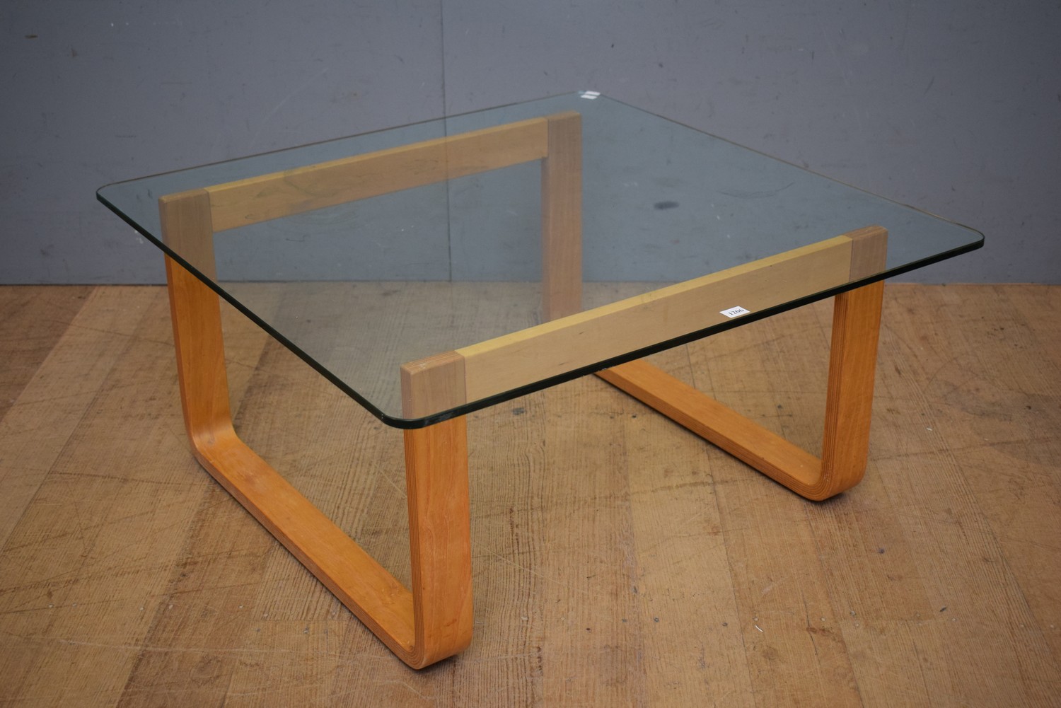 A MID-CENTURY GLASS TOPPED COFFEE TABLE (36H X 76W X 76D CM) (LEONARD JOEL DELIVERY SIZE: LARGE)