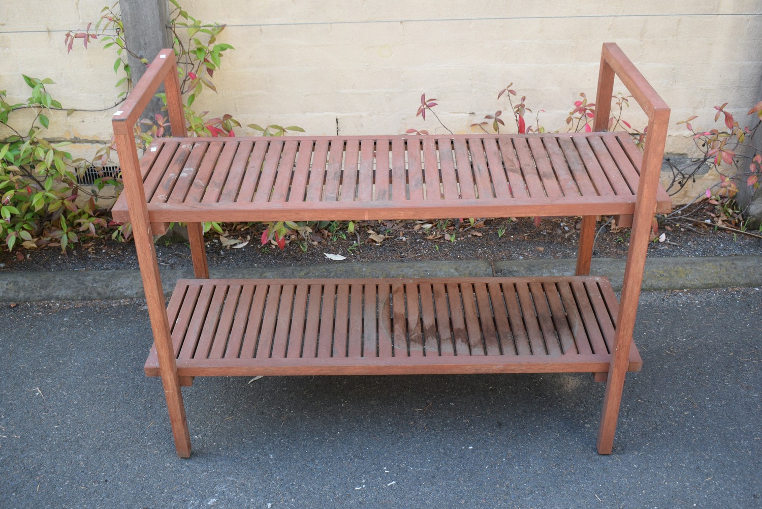 A TEAK OUTDOOR CONSOLE TABLE BY ROBERT COUSENS (A/F) (93H X 120W X 45D CM) (LEONARD JOEL DELIVERY SIZE: LARGE)