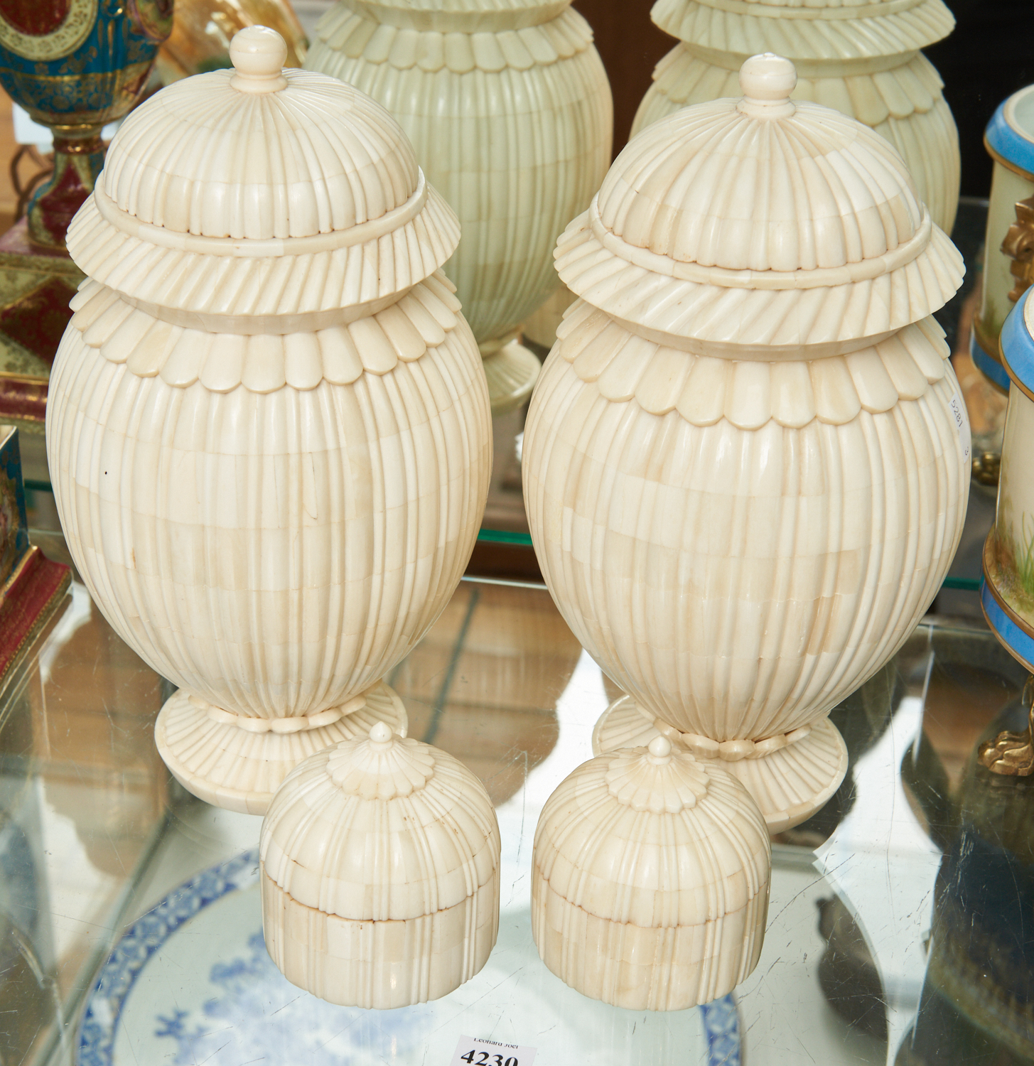 A GROUP OF FOUR LIDDED VESSELS WITH BONE VENEER, LEONARD JOEL LOCAL DELIVERY SIZE: SMALL