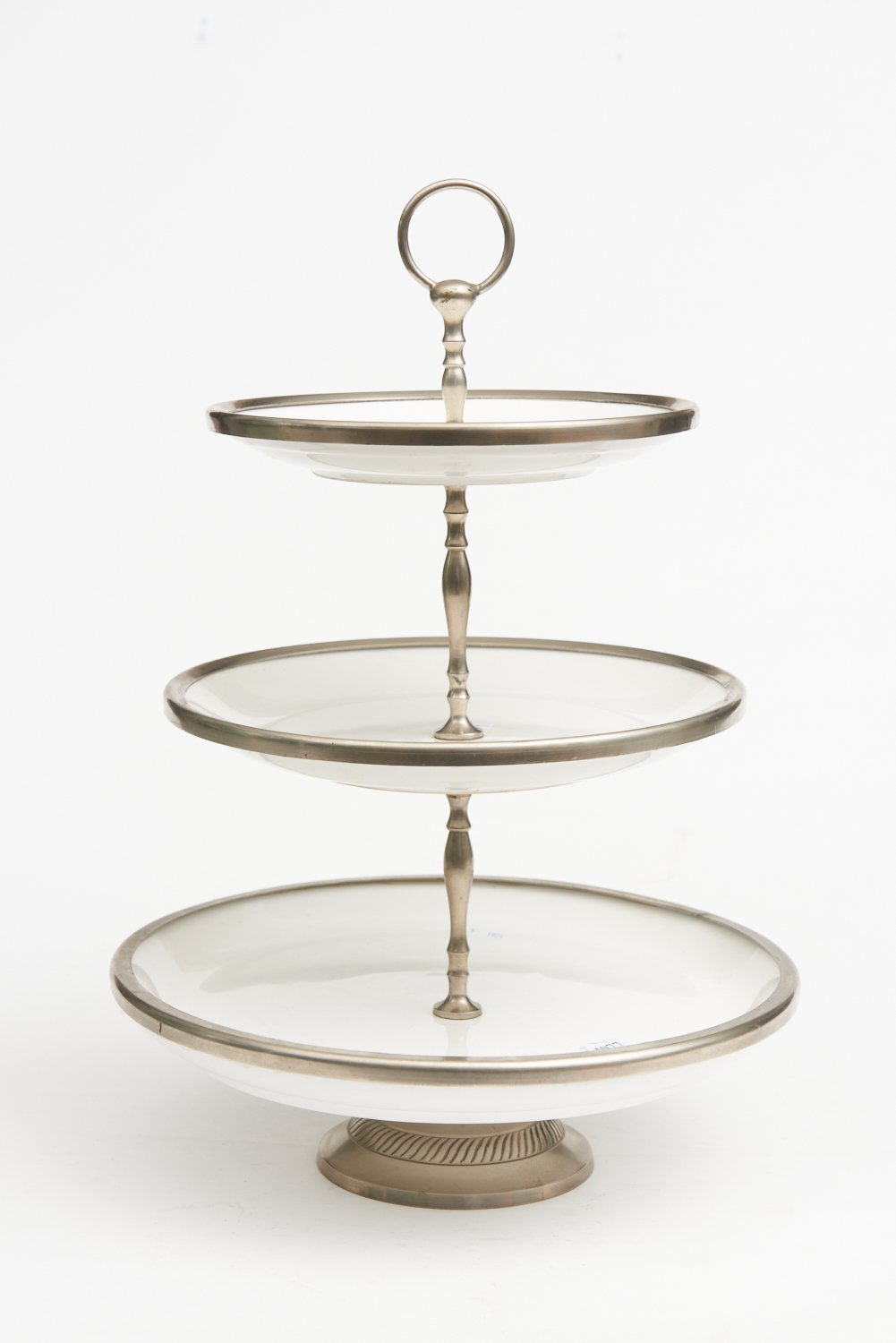 A THREE TIER CERAMIC AND METAL CAKE STAND (50 CM H), LEONARD JOEL LOCAL DELIVERY SIZE: SMALL