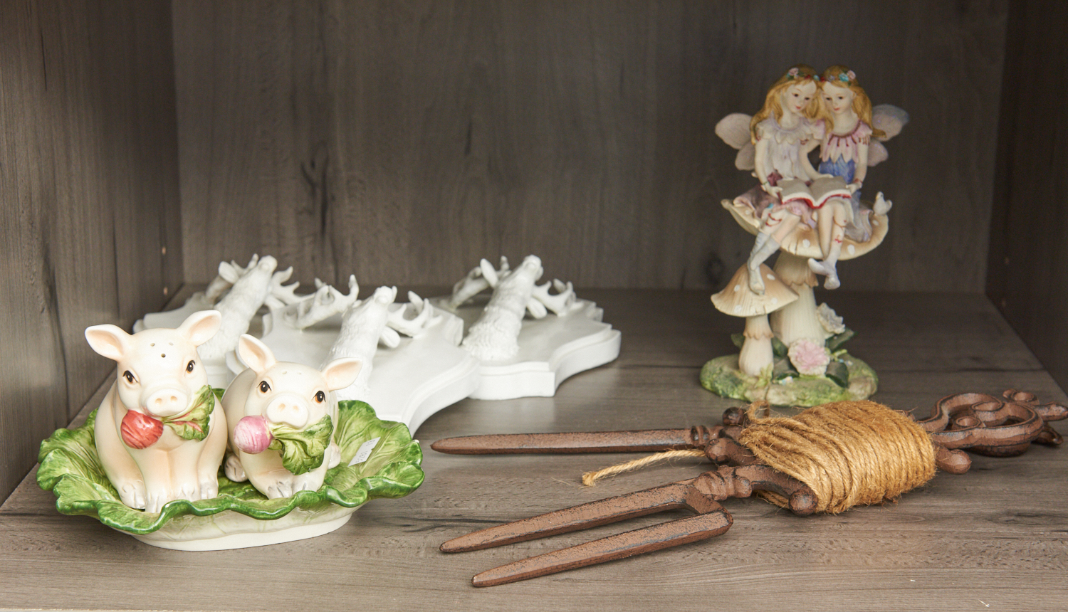 A SHELF LOT OF ASSORTED ITEMS INCLUDING FITZ & FLOYD 'FRENCH MARKET' SALT AND PEPPER SET, LEONARD JOEL LOCAL DELIVERY SIZE: SMALL