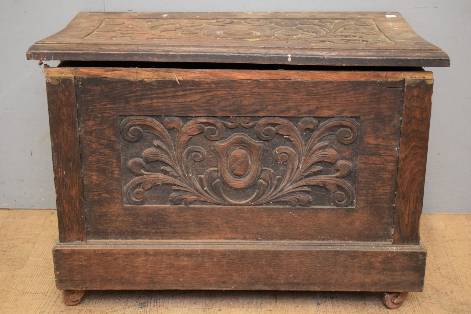 AN ANTIQUE OAK CARVED WOOD BOX (A/F) (H58 X W77 X D47 CM) (LEONARD JOEL DELIVERY SIZE: LARGE)