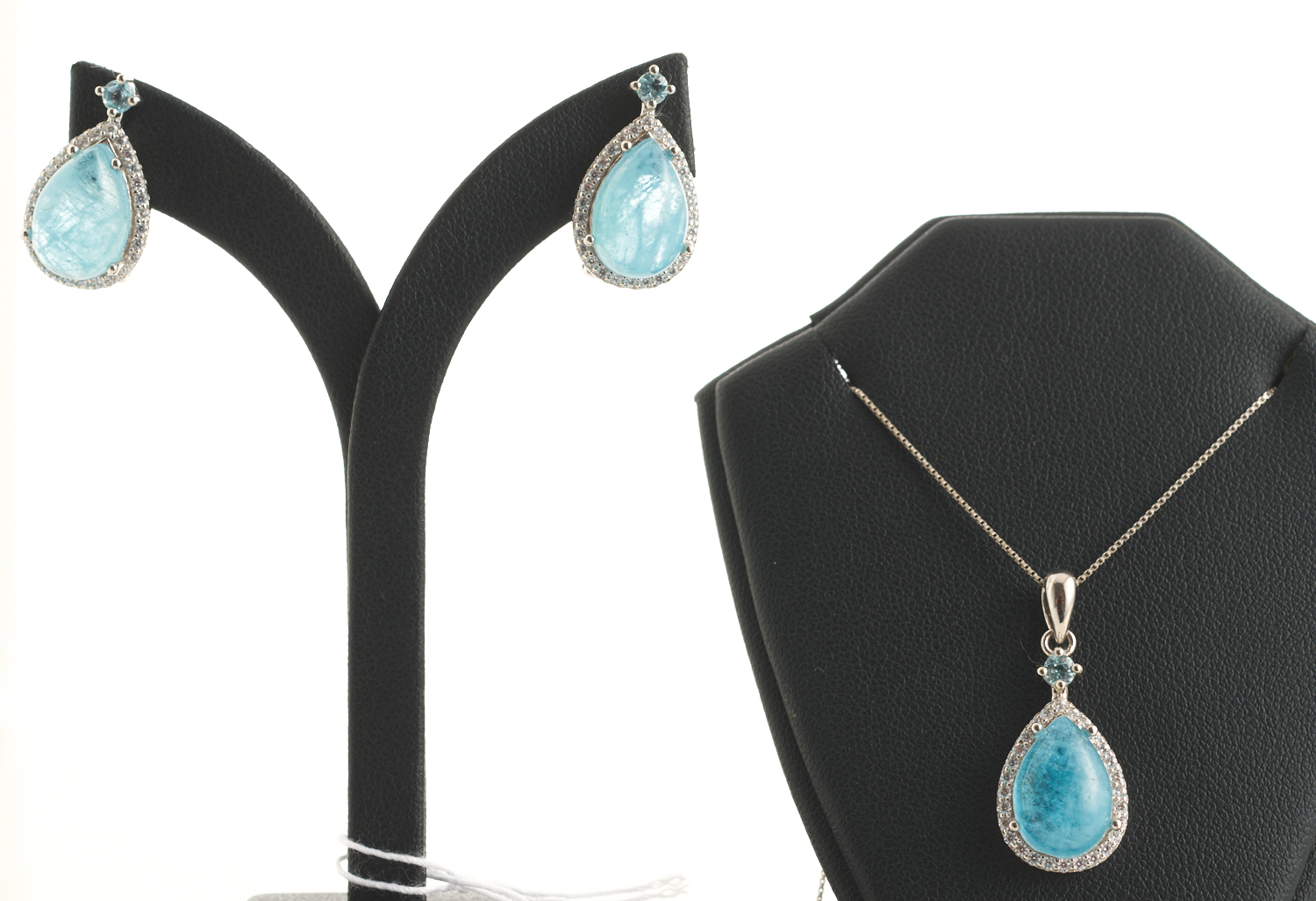 AN AQUAMARINE, DIAMOND AND CLEAR STONE JEWELLERY SUITE INCLUDING EARRINGS AND A PENDANT NECKLACE, IN STERLING SILVER