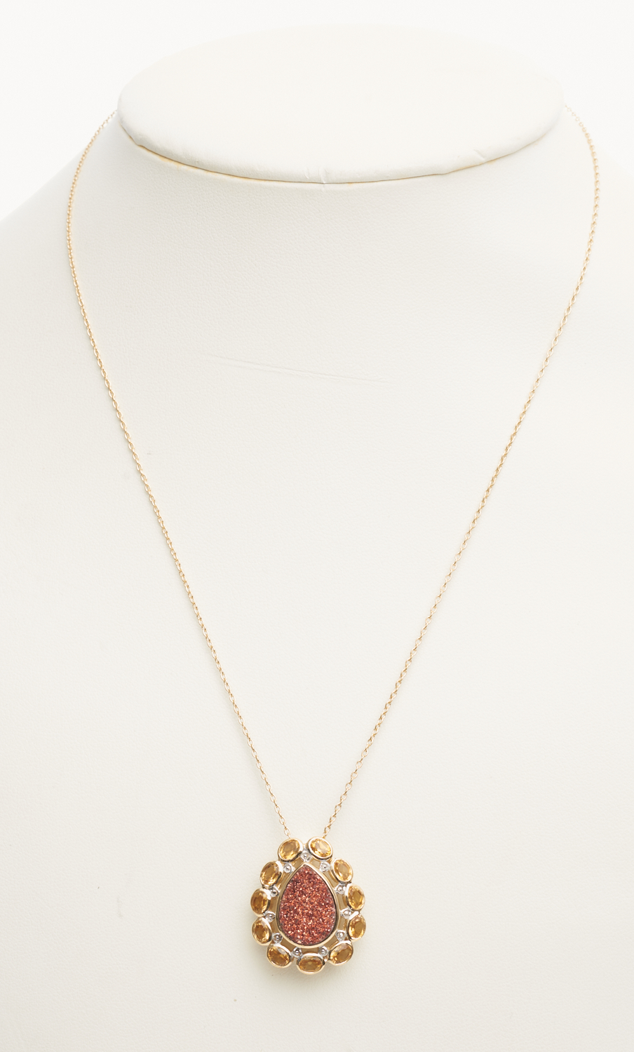A GOLDSTONE AND CITRINE PENDANT IN SILVER GILT, TOTAL LENGTH 45CM