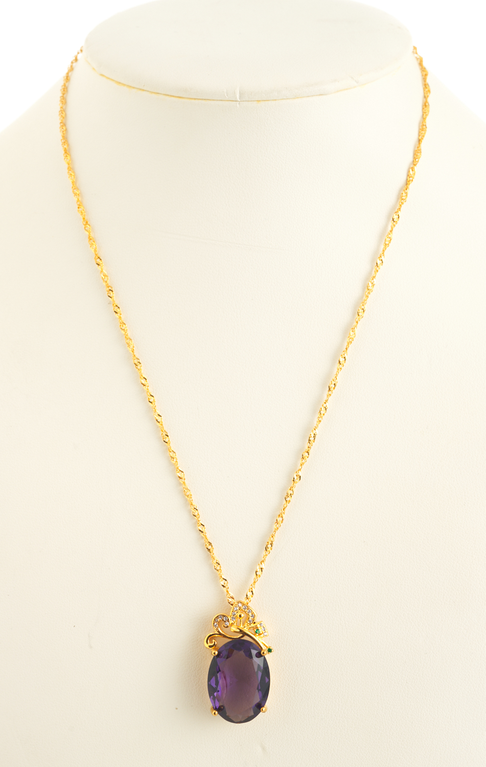 A SYNTHETIC AMETHYST, GREEN STONE AND CLEAR STONE PENDANT IN SILVER GILT