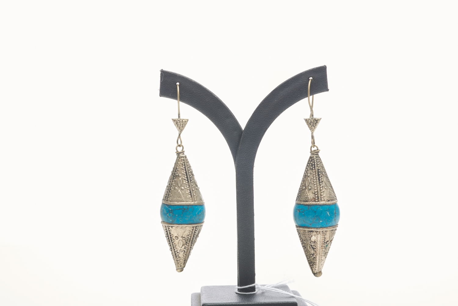 A PAIR OF ETHNIC DYED HOWLITE DROP EARRINGS IN METAL, TO HOOK FITTINGS, LENGTH 80MM