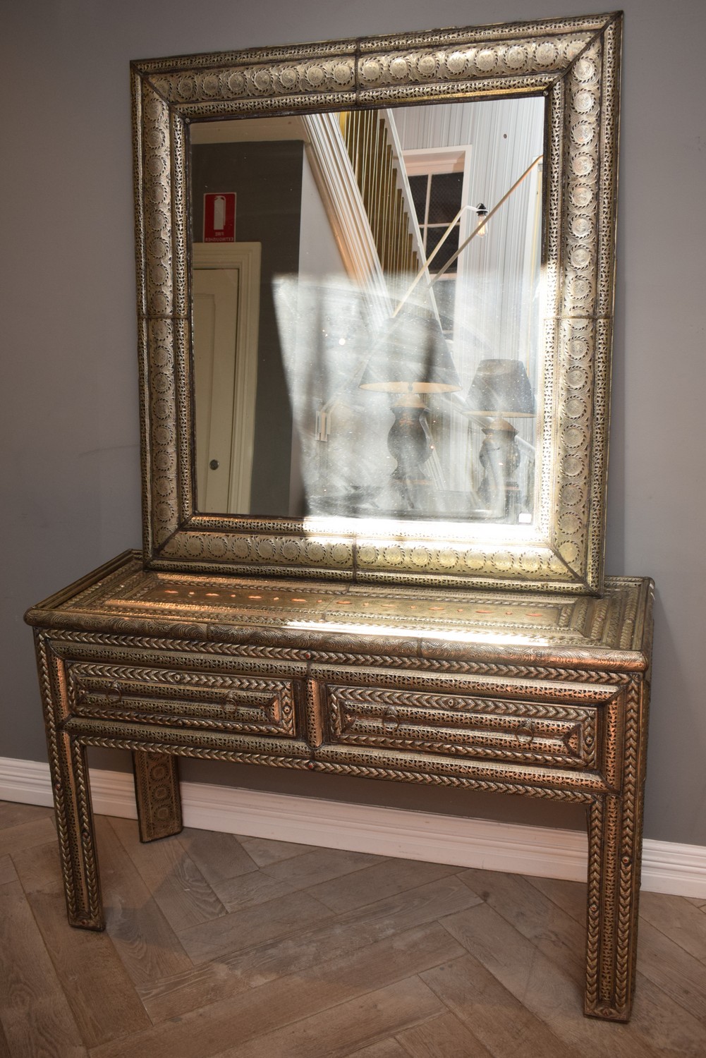 MORROCCAN HAND BEATED CONSOLE AND MATCHING MIRROR (CONSOLE 88H x 125W x 55D CM) (PLEASE NOTE THIS HEAVY ITEM MUST BE REMOVED BY CARRIERS AT THE CUSTOMER'S EXPENSE. LEONARD JOEL STAFF CANNOT ASSIST CARRYING THIS ITEM) (X-LARGE ITEM)