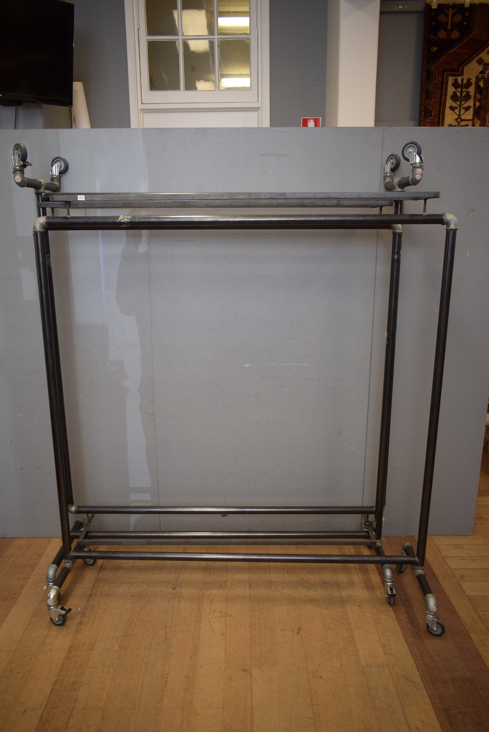 THREE INDUSTRIAL COAT RACK WITH TOP SHELVES (178H x 172W x 52D CM) (PLEASE NOTE THIS HEAVY ITEM MUST BE REMOVED BY CARRIERS AT THE CUSTOMER'S EXPENSE. LEONARD JOEL STAFF CANNOT ASSIST CARRYING THIS ITEM) (X-LARGE ITEM)