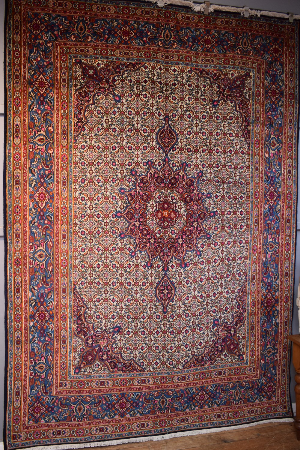 A VERY INTRICATE HAND-KNOTTED PERSIAN BIRJAND MOOD CARPET, 100% WOOL. SOLID & DENSE PILE. CLASSIC MOOD DESIGN OF SUNBURST MEDALLION & QUARTERED CORNER MEDALLIONS IN A FIELD OF FLORAL HERATI MAHI PATTERNS. BORDER OF ROSETTES AND HERATI PATTERNS. WITH BEAUTIFUL TONNES OF BLUE, REDS AND LIGHT PINK. SIZE: 315X220CM CERTIFICATE OF AUTHENTICITY INCLUDED. ORIGIN: IRAN - RRP: $5,500