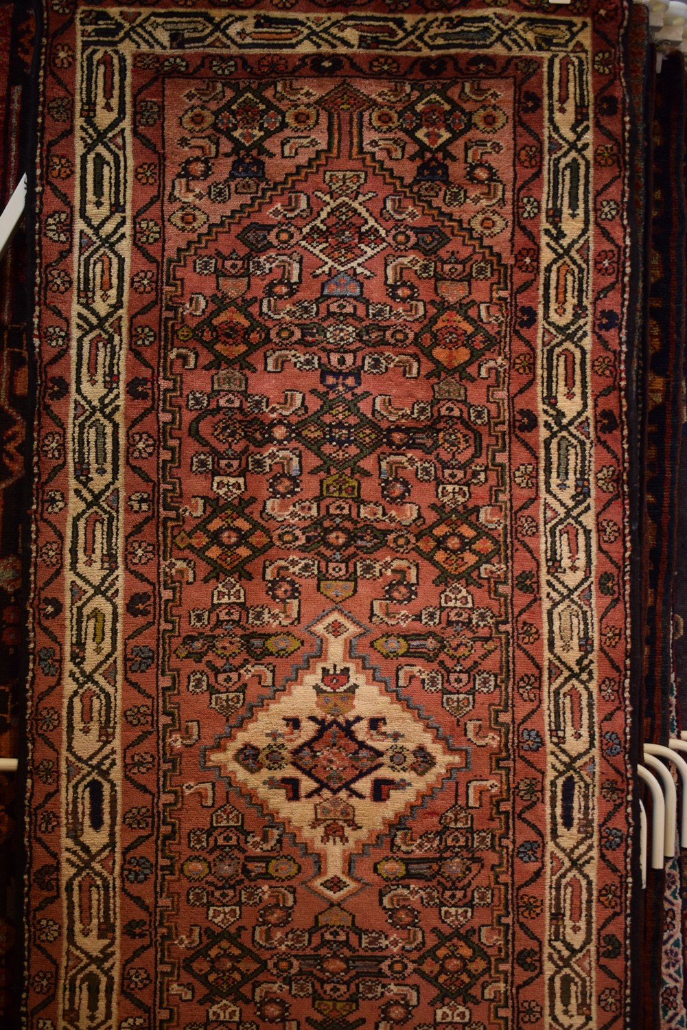 A PERSIAN HOSSAINABAD HALL RUNNER. 100% WOOL. DENSE PILE. IN GOOD CONDITION. HAND-KNOTTED VILLAGE WEAVE FROM THE HAMADAN REGION WITH TRIBAL DESIGN OF ALL-OVER BOLD HERATI MAHI PATTERNS SET WITHIN A SOFT PEACH WITH A CENTRAL MEDALLION IN A CREAM FIELD. SIZE: 232X95CM ORIGIN: IRAN - RRP: $1,400 CERTIFICATE OF AUTHENTICITY INCLUDED.