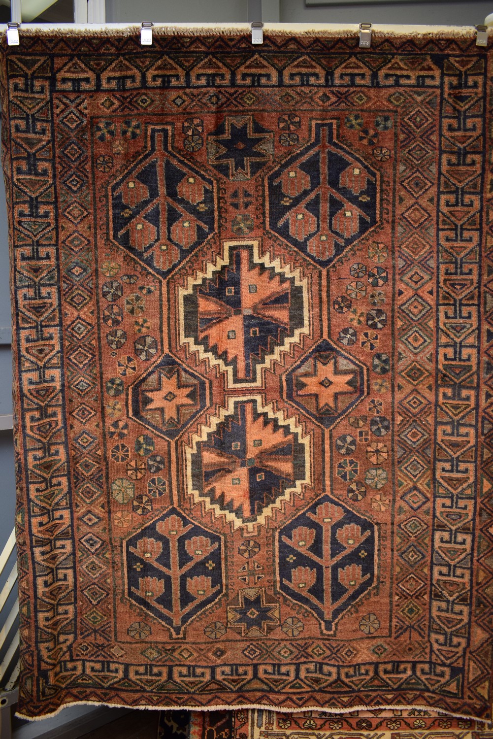 A CIRCA 1940'S TRIBAL PERSIAN KOHI RUG, 100% VINTAGE WOOL PILE. NATURAL DYES WITH NATURAL ABRASH DISCOLORATION. HAND-KNOTTED TRIBAL WEAVE WITH DESIGN OF DOUBLE BOLD ANCHORED MEDALLIONS IN A FIELD OF TRIBAL PATTERNS. BORDER OF ROSETTES. EX-GALLERY INVENTORY. IN GOOD CONDITION. CERTIFICATE OF AUTHENTICITY INCLUDED. SIZE: 212X160CM ORIGIN: PERSIA - RRP: $2,400