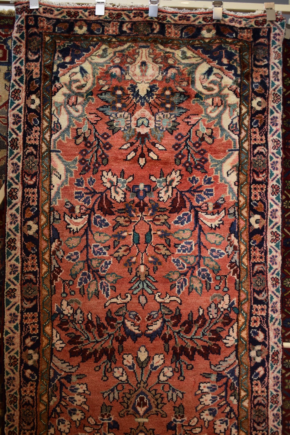 A CLASSIC PERSIAN SAROUQ MAHAL HALL RUNNER, 100% WOOL. DENSE PILE. HAND-KNOTTED VILLAGE WEAVE WITH CLASSIC PERSIAN FLORAL DESIGN OF CENTRAL MEDALLION IN A RED FIELD OF PALMETTES AND URNS BEARING FLORAL SPRAYS. FLORAL BORDER. IN EXCELLENT CONDITION. SIZE: 310X108CM ORIGIN: IRAN - RRP: $2,800 CERTIFICATE OF AUTHENTICITY INCLUDED.
