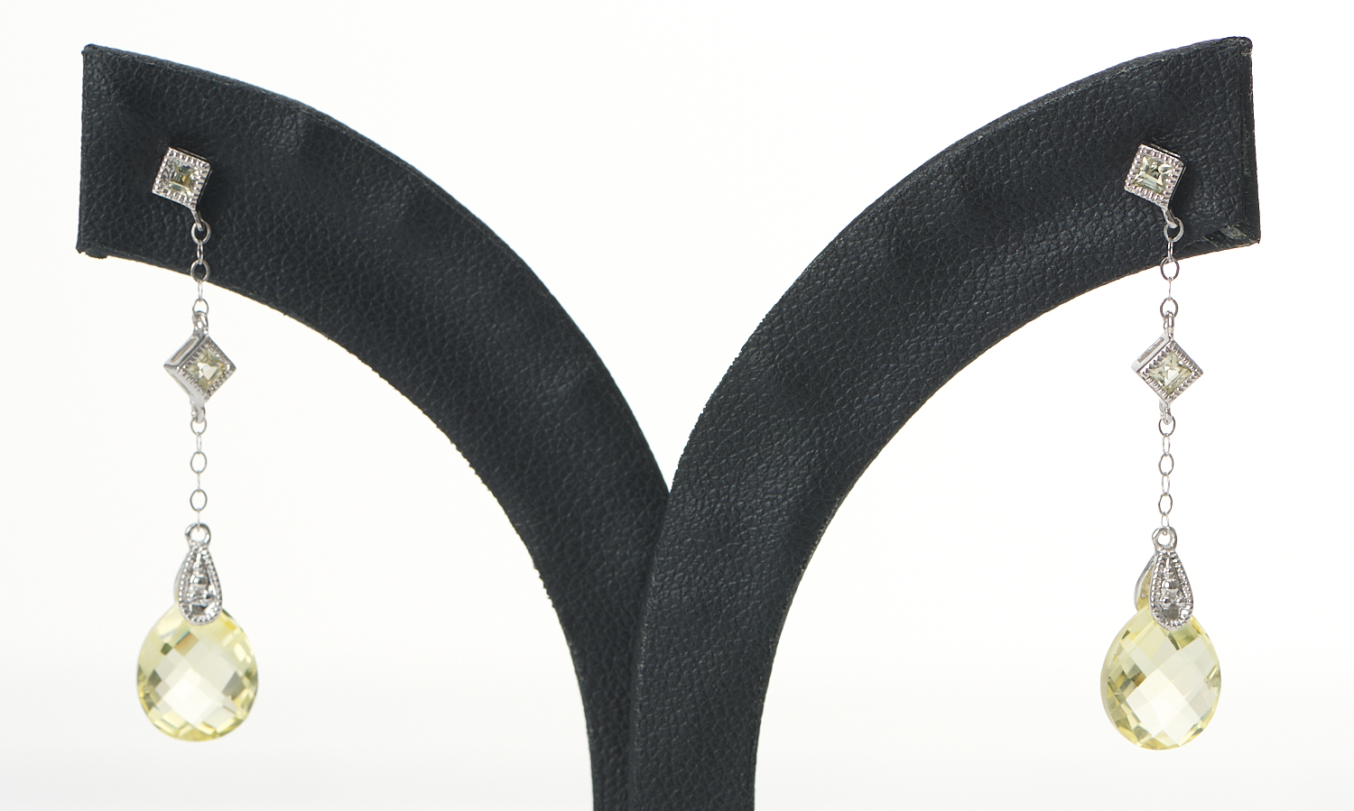A PAIR OF BRIOLETTE CUT CITRINE DROP EARRINGS IN 10CT WHITE GOLD, TO POST FITTINGS, LENGTH 40MM