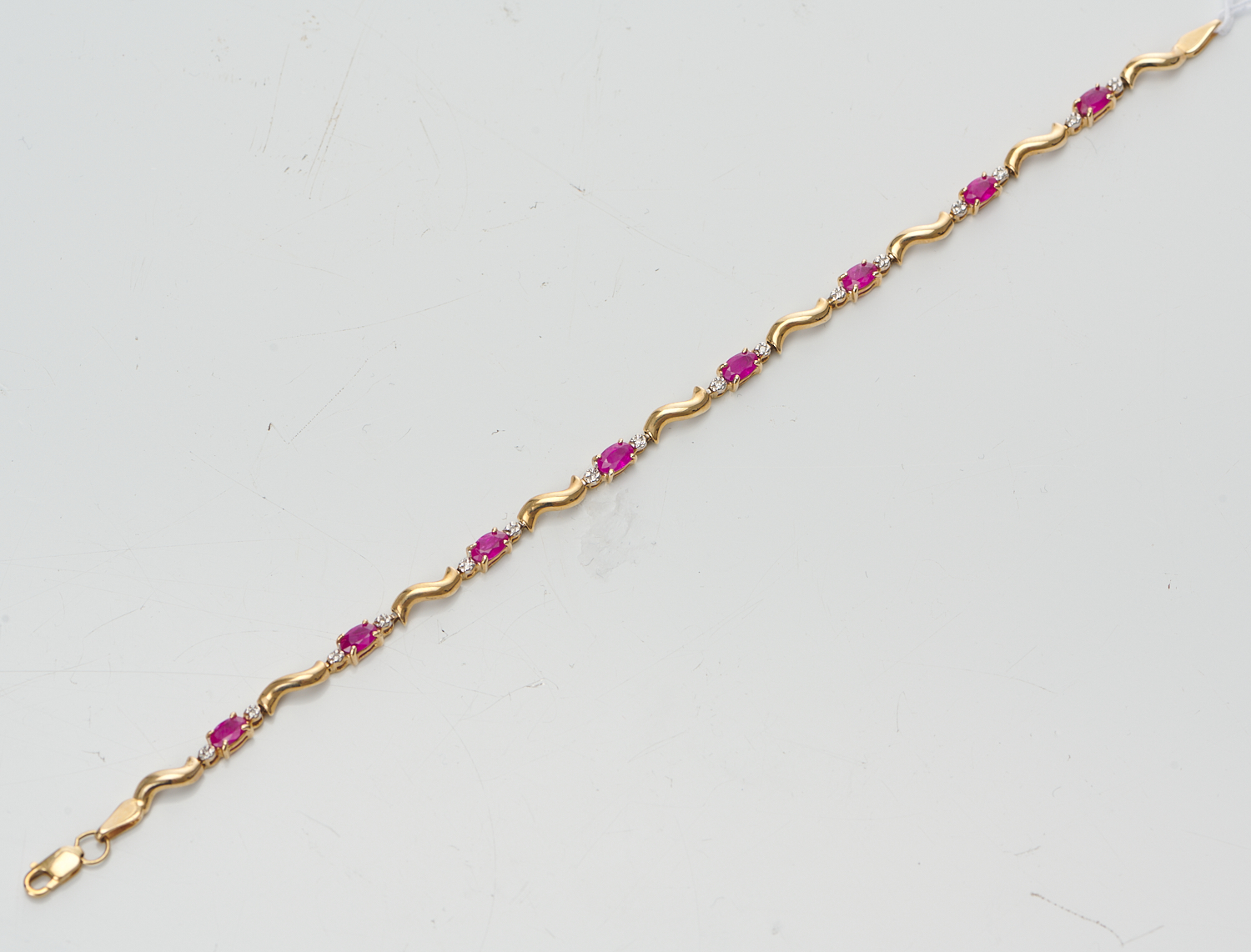 A FLORAL BRACELET IN 10CT GOLD FEATURING OVAL CUT RUBIES AND DIAMONDS, LENGTH 18CM, 4.7GMS