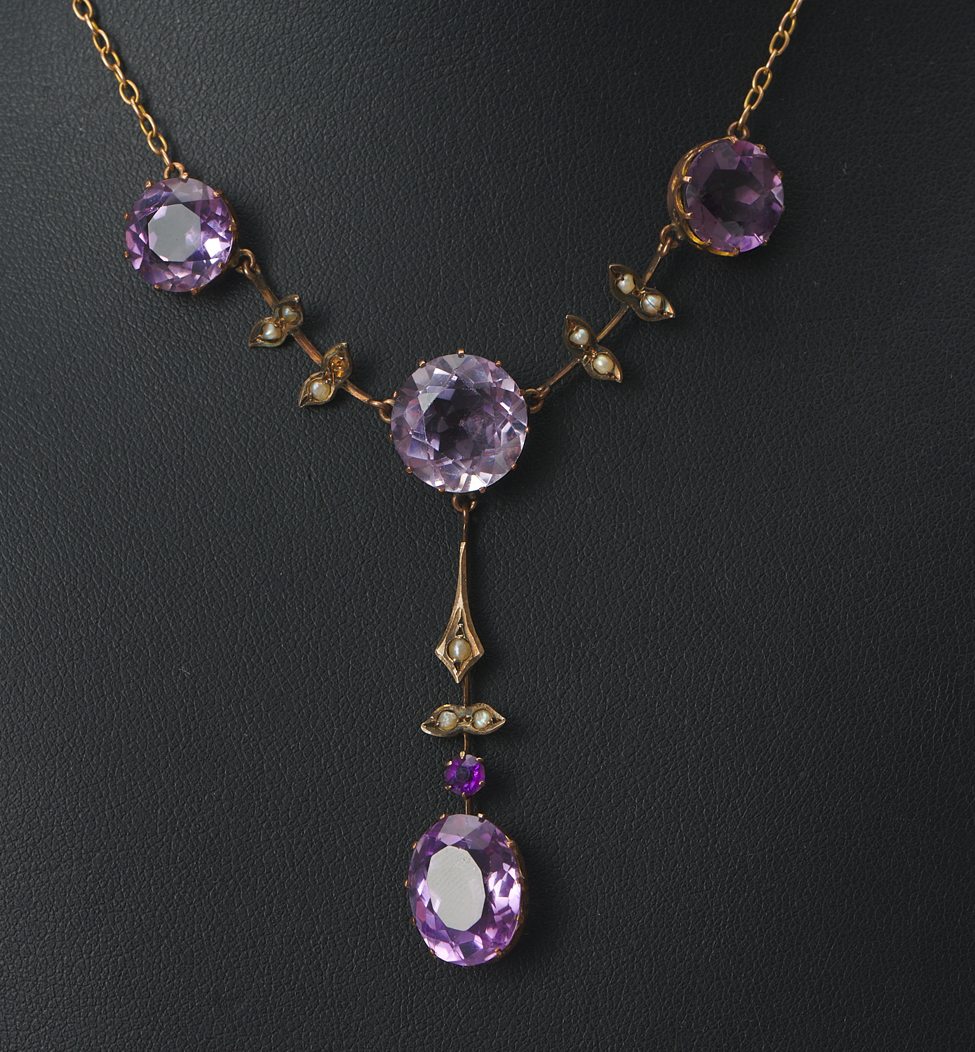 AN EDWARDIAN DROP NECKLACE IN 10CT GOLD, COMPRISING SEED PEARLS (ONE MISSING) AND AMETHYST (INCLUDING TWO PASTE), LENGTH 39CM