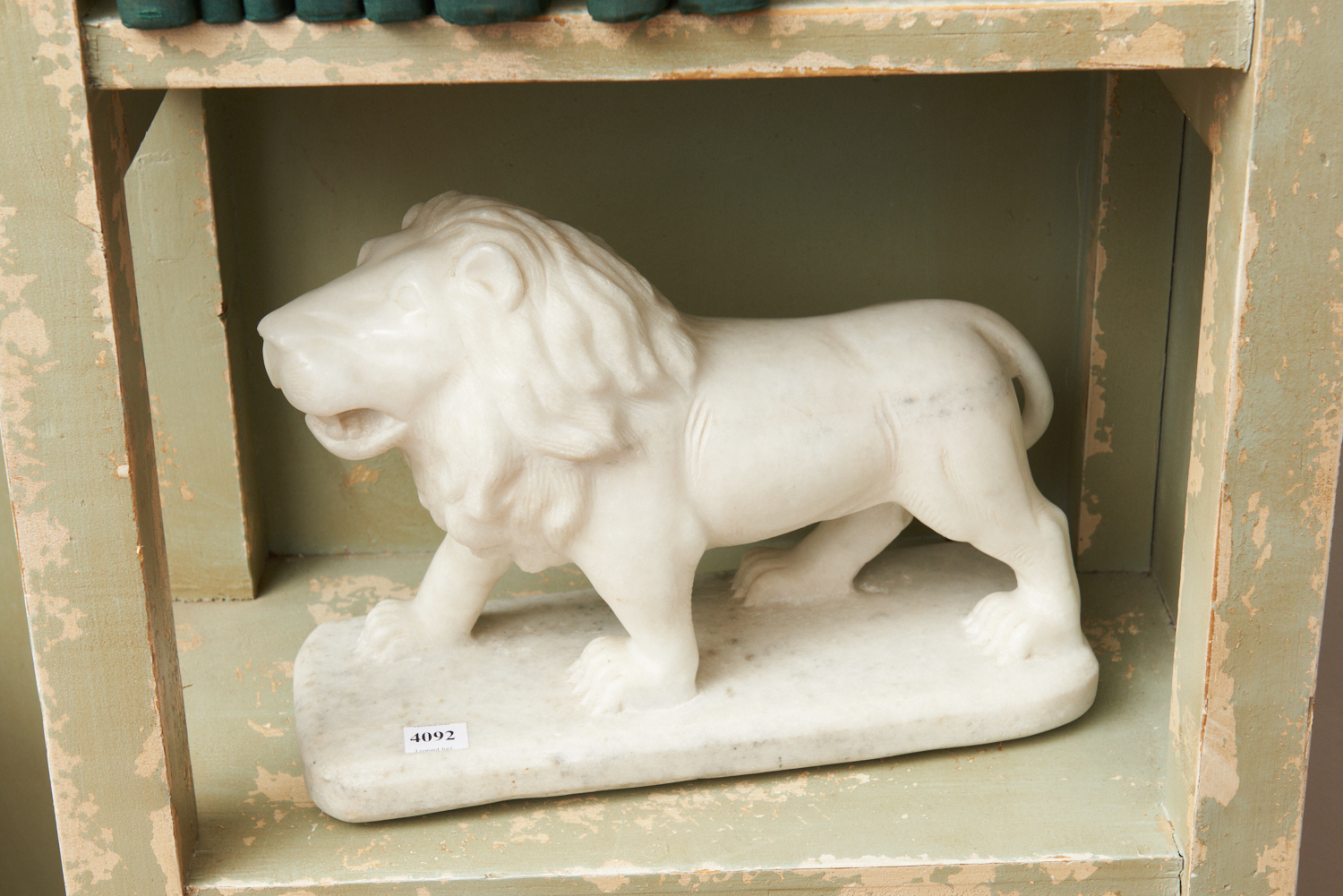 A CARVED WHITE MARBLE LION (32 CM W), LEONARD JOEL LOCAL DELIVERY SIZE: SMALL