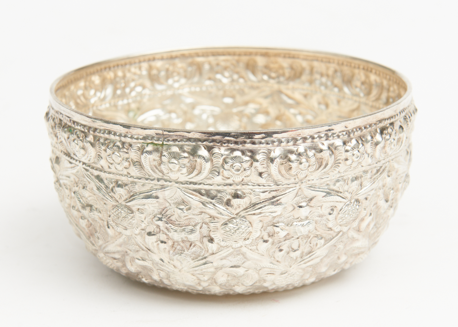 A THAI SILVER PLATED ANIMAL DECORATED BOWL (15.5 CM D), LEONARD JOEL LOCAL DELIVERY SIZE: SMALL