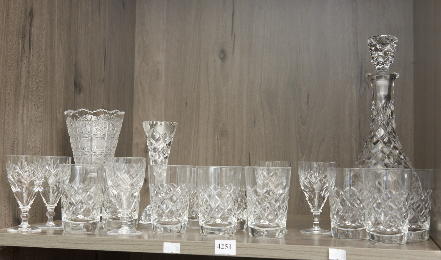 A COLLECTION OF CRYSTAL INCLUDING DECANTER, VASES AND GLASSES, LEONARD JOEL LOCAL DELIVERY SIZE: SMALL