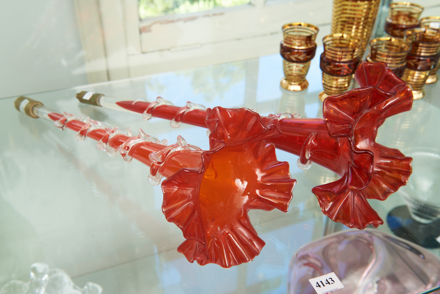 A PAIR OF RED GLASS EPERGNE TRUMPETS (40 CM H), LEONARD JOEL LOCAL DELIVERY SIZE: SMALL
