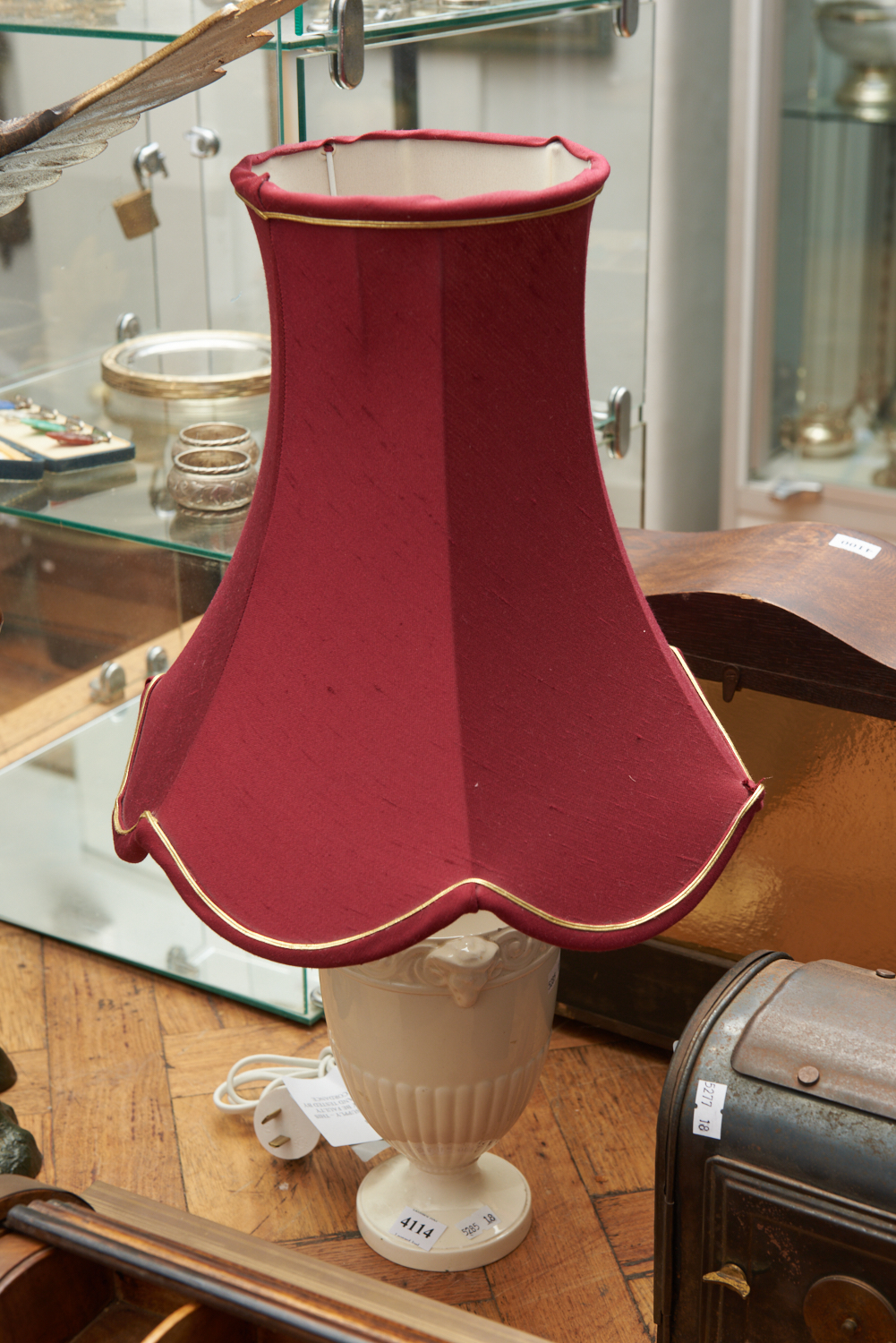 A WHITE WEDGWOOD LAMP BASE WITH RED SHADE, LEONARD JOEL LOCAL DELIVERY SIZE: SMALL
