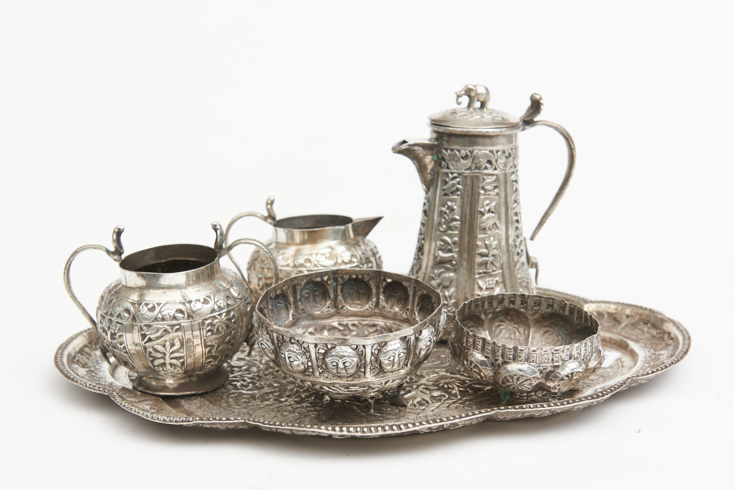 AN INDIAN SILVER COFFEE SET COMPRISING COFFEE POT, JUG AND SUGAR BOWL ON TRAY WITH TWO MATCHED BOWLS, UNMARKED BUT TESTED, TOTAL WEIGHT APPROX. 1,431 GRAMS, LEONARD JOEL LOCAL DELIVERY SIZE: SMALL