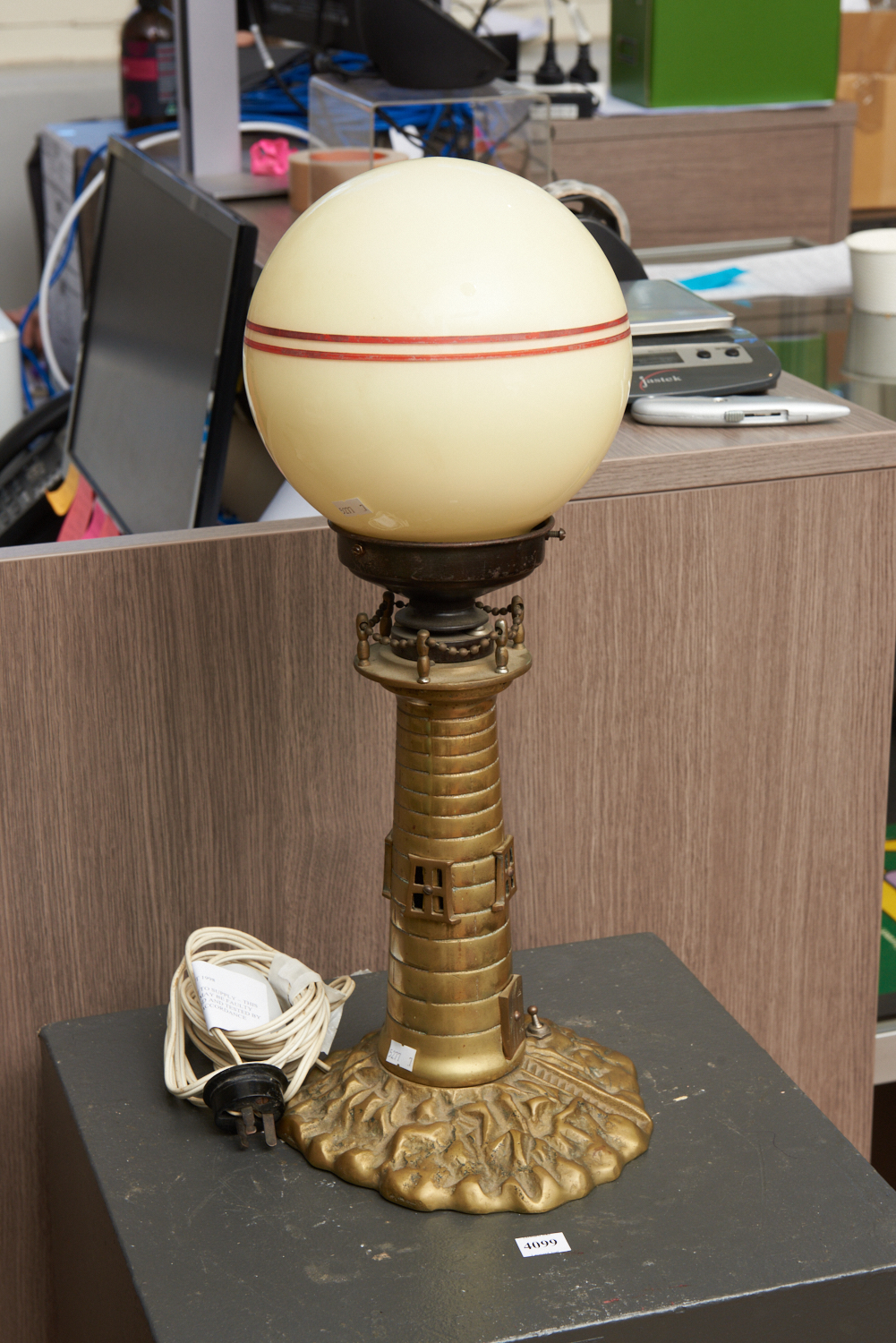 A BRASS LIGHTHOUSE LAMP WITH GLASS SHADE (53 CM H), LEONARD JOEL LOCAL DELIVERY SIZE: SMALL